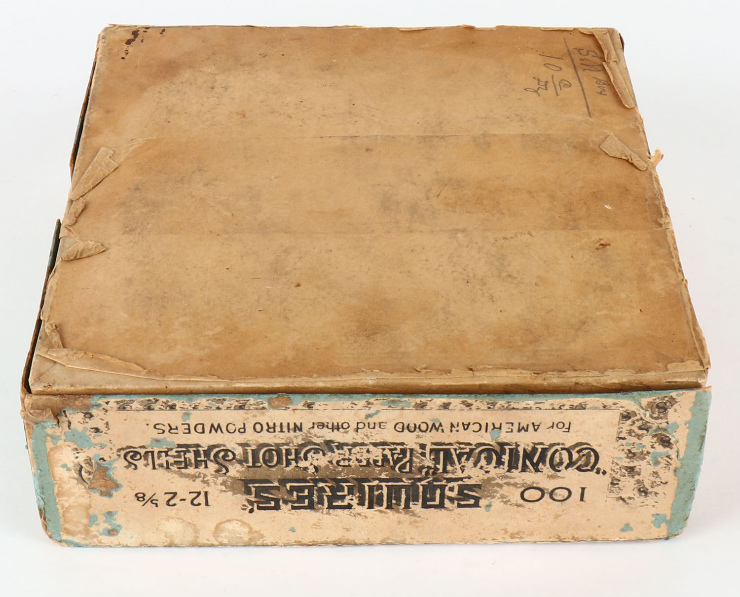 Squires, ''Conical'', NPE, 12ga., 2pc, Empty, 2 5/8'', buff box with buff and blue label, box has scuffing with age soiling, has a missing end flap with edge wear. Grade: Good ++ - Value: 300 to 1000
