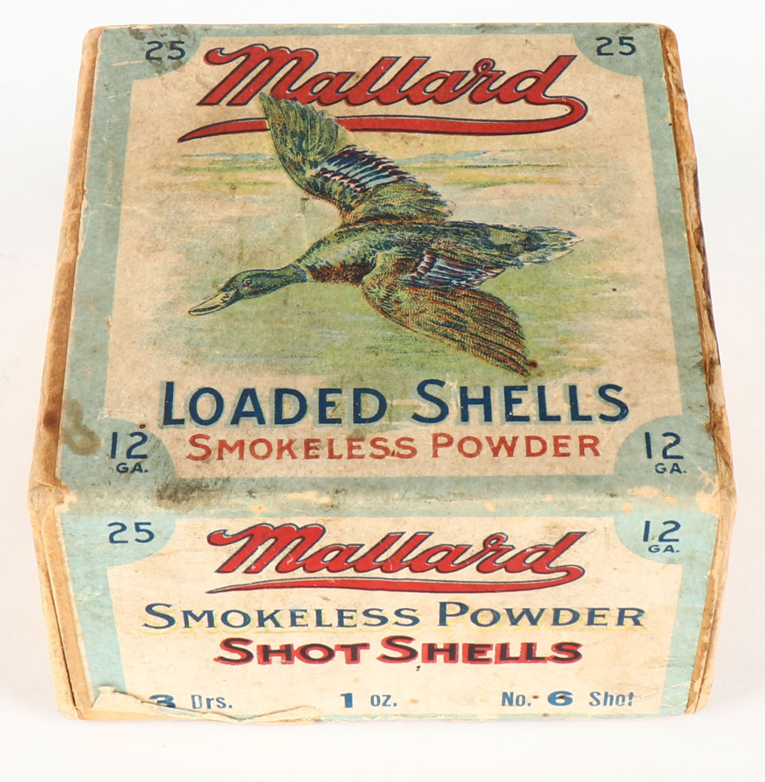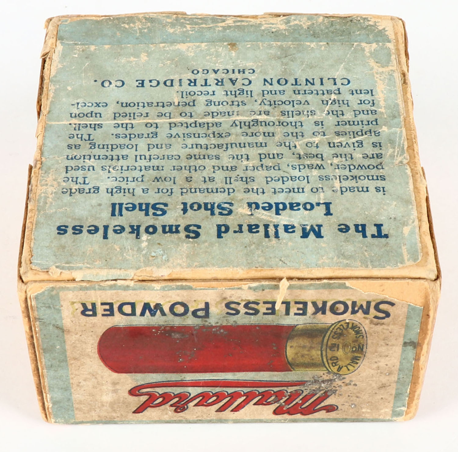 RARE! Clinton Cartridge Co., MALLARD, 12ga., 2pc., Empty, shot size 6, Loading 3 Drs. 1oz. No. 6 Shot, buff box with multi colored label picturing a Mallard flying down, box has very nice colors with light soiling & scuffing, has glue repair to seam, label is 100% ORIGINAL, VERY RARE BOX! Grade: Very Good ++ - Value: 400 to 1000