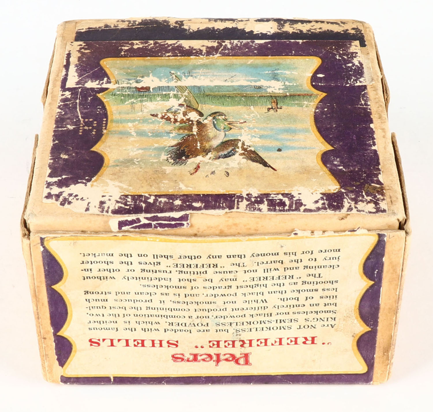 Peter's Cart., Referee, 10ga., 2pc., Partial 17 rds., Shot size 6, Loading: No. B 76, 2 7/8'', 4 Drs., 1 1/8 Oz., No. 6 Shot, buff box with multi-colored label flying ducks, box has light age soiling with scuffing, paper shells are very good. Grade: Very Good ++ - Value: 200 to 500