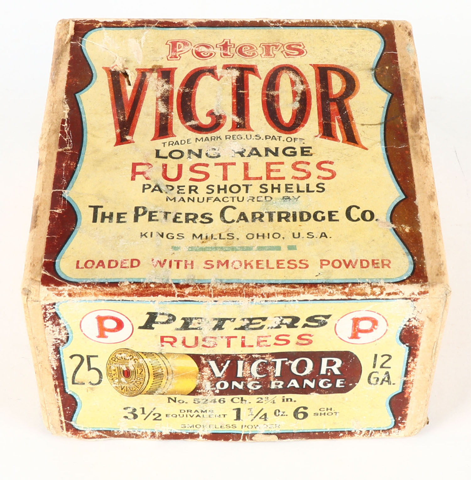 Peters Cart. Div., Victor, Rustless, 12ga., 2 3/4'', 2pc., Empty, shot size 6 CH, buff box with brown, cream & black label, box has scuffing with age soiling. Grade: Good ++ - Value: 50 to 200