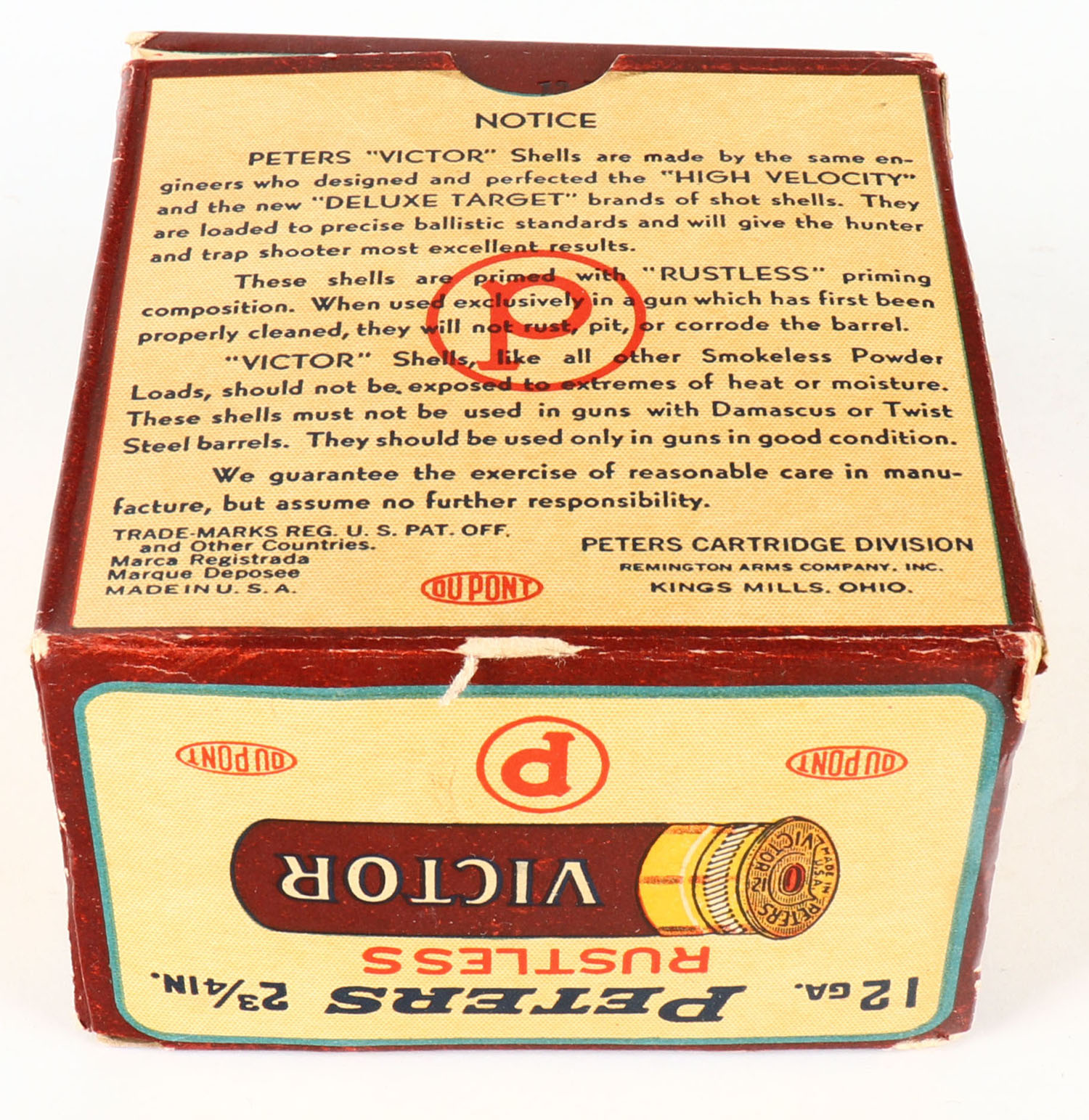 Peters, Victor, U.S. Property 12ga, 1pc., Full, shot size 00 Buck, Maroon, cream & orange box, 2 3/4'', box is very solid with excellent colors, paper shells are excellent. Grade: Excellent + - Value: 40 to 150