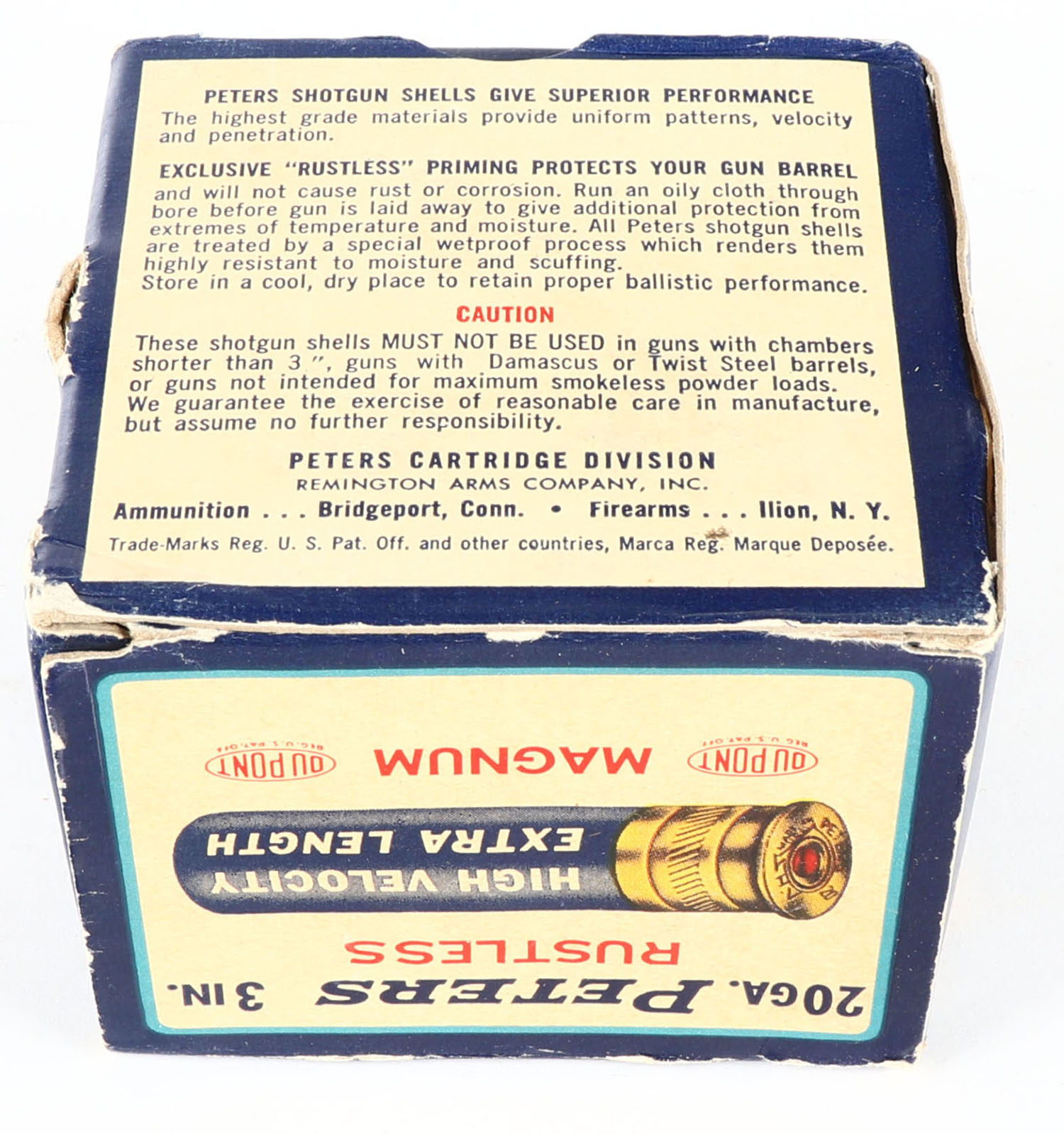 Peters Cart. Co., Bridgeport, CT, High Velocity, EXTRA LENGTH MAGNUM, 20ga., 1pc., Full, shot size 7 1/2, multi colored box that pictures mallard flying out of the marsh grass, box has shell protrusions with great color to box, paper shells are excellent. Grade: Very Good + - Value: 80 to 300