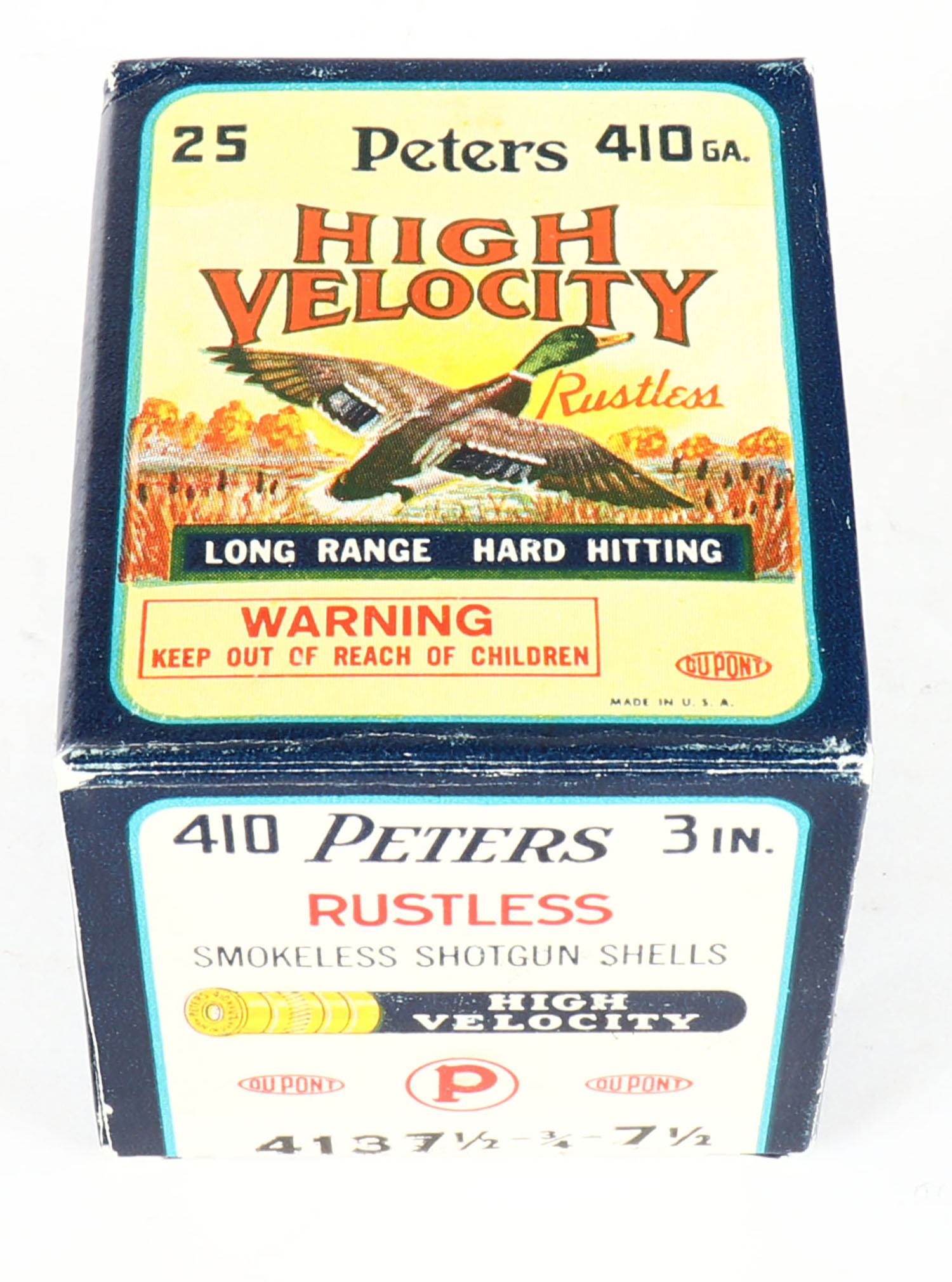 Peters, High Velocity, 410ga., 3'', 1pc., Full, shot size 7 1/2, multi-colored box with mallard duck flying out of marsh grass, box is very solid with great colors, paper shells are minty. Grade: MINT - Value: 40 to 200