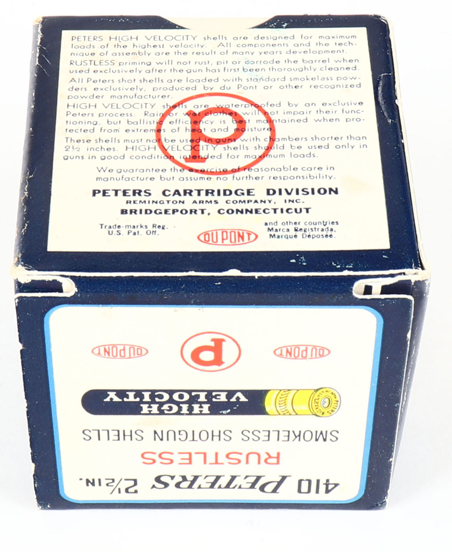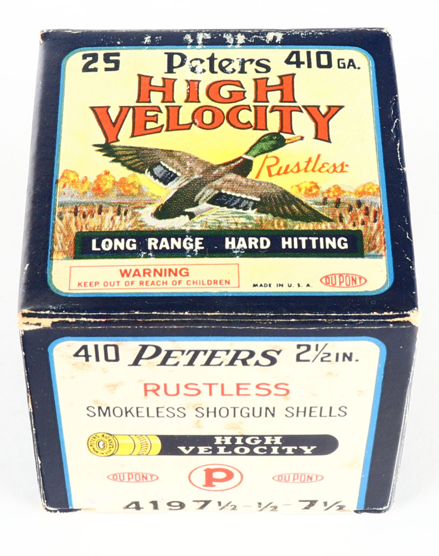 Peters, High Velocity, 410ga., 2 1/2'', 1pc., Full, shot size 7 1/2, multi-colored box with mallard duck flying out of marsh grass, box is very solid with excellent colors, paper shells are excellent. Grade: Excellent ++ - Value: 40 to 100
