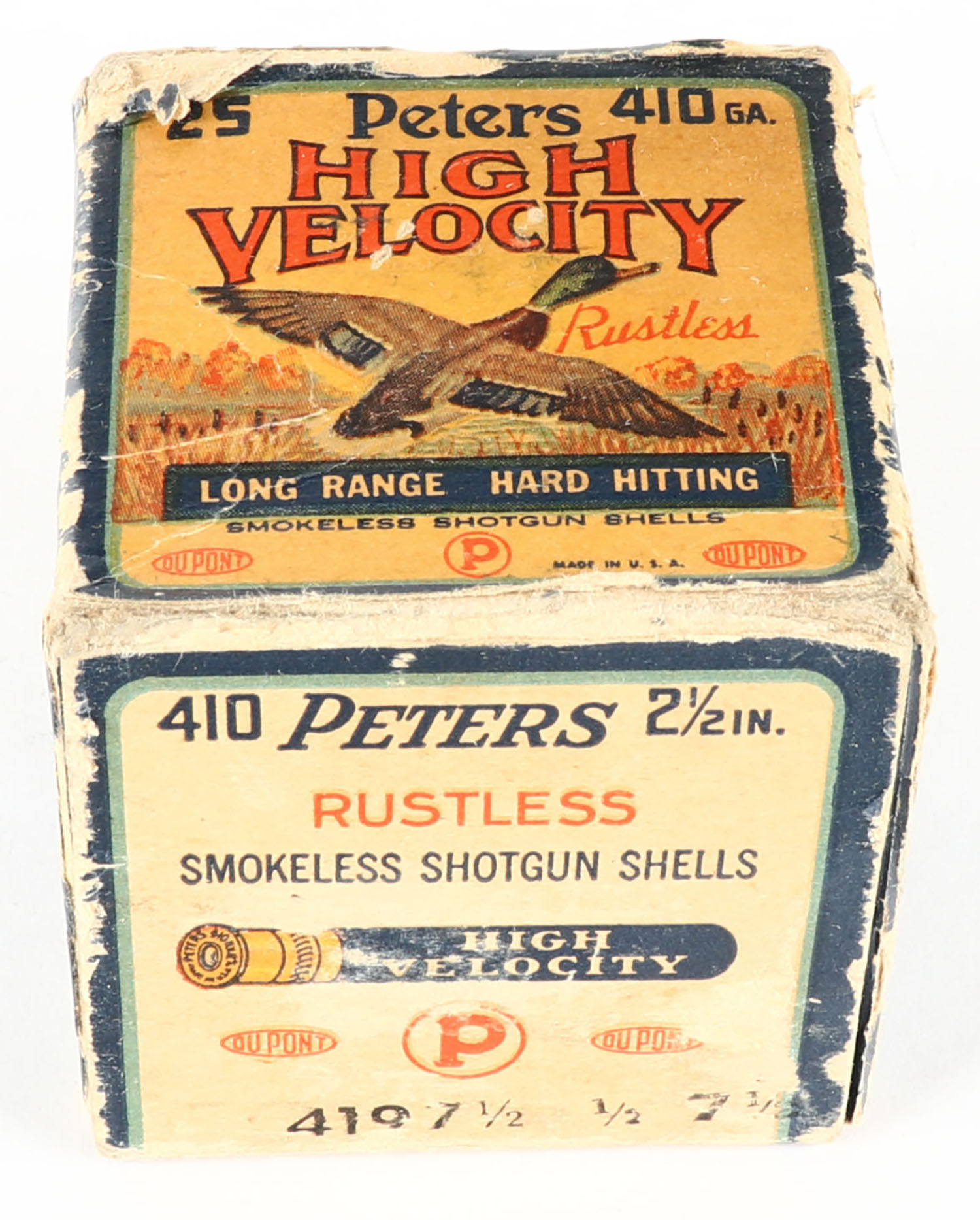 Peters, High Velocity, 410ga., 2 1/2'', 1pc., Full, shot size 7 1/2, multi-colored box with mallard duck flying out of marsh grass, box has age soiling & edge wear, paper shells are very good. Grade: Good - Value: 20 to 100