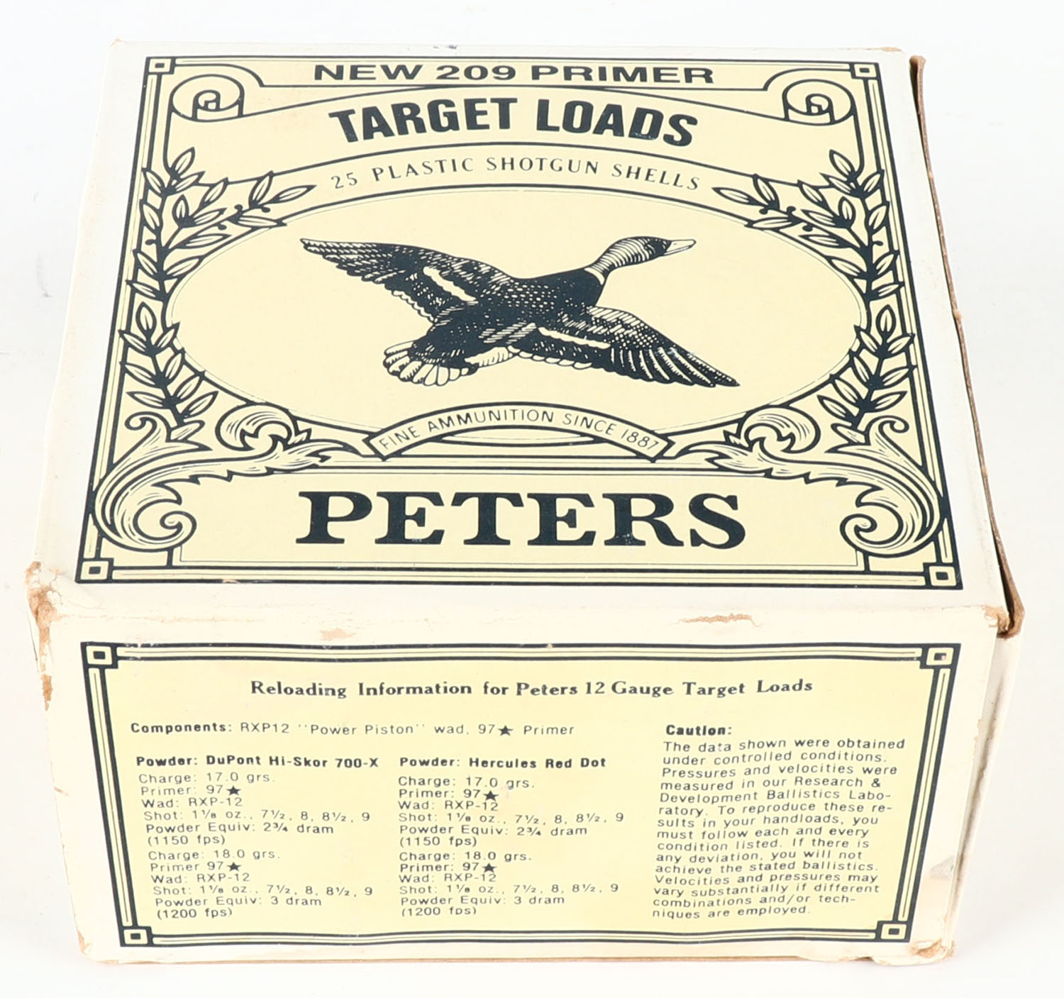 Peters Cart. Div., Light Target Loads, 12ga., 2 3/4'', 1pc., Full, shot size 9, multi colored box, box has great colors, plastic shells are excellent. Grade: Excellent + - Value: 10 to 40