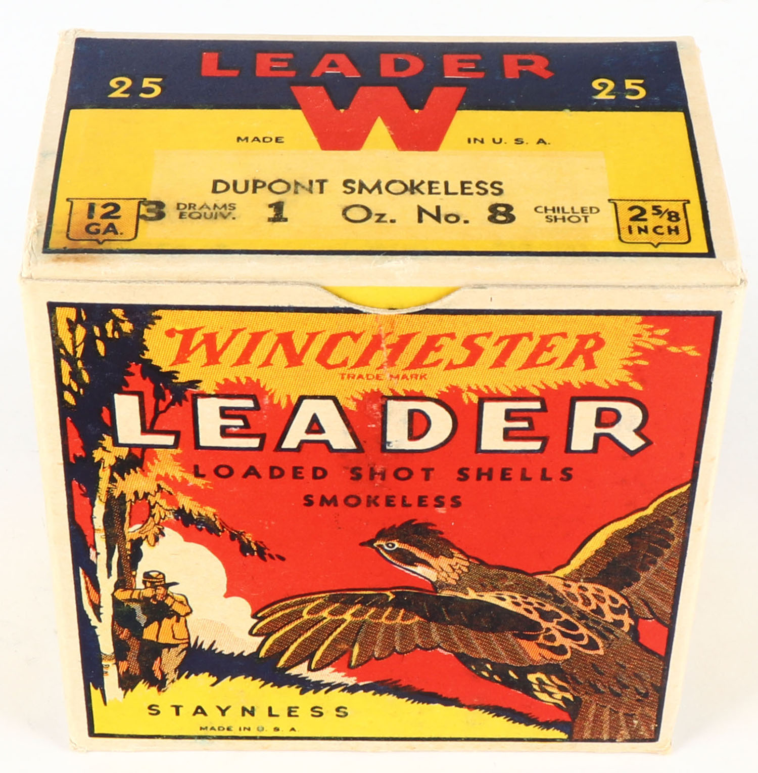 Winchester, LEADER QUAIL BOX, with Acrylic box, NEAR MINT, 12ga., 1pc., Full, shot size 8 Chilled, multi colored box with flying Quail & hunter in background, Staynless, 2 5/8'', Loading: 3 Drams 1 Oz. No. 8 Chilled Shot, box is very solid with amazing colors, Shells are excellent. Grade: Excellent ++ - Value: 600 to 1200