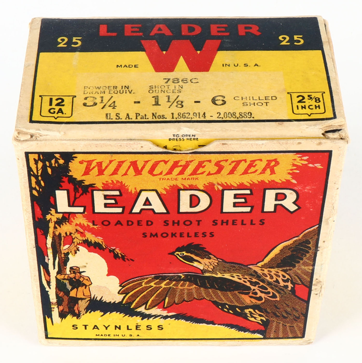 Winchester, LEADER QUAIL BOX, 12ga., 1pc., Partial 16rds, shot size 6 Chilled, multi colored box with flying Quail & hunter in background, Staynless, 2 5/8'', Loading: 3 1/4 Drams 1 1/8 Oz. 6 Chilled Shot, box is solid with small edge wear on right side, has great colors, paper shells are excellent. Grade: Excellent + - Value: 600 to 1000