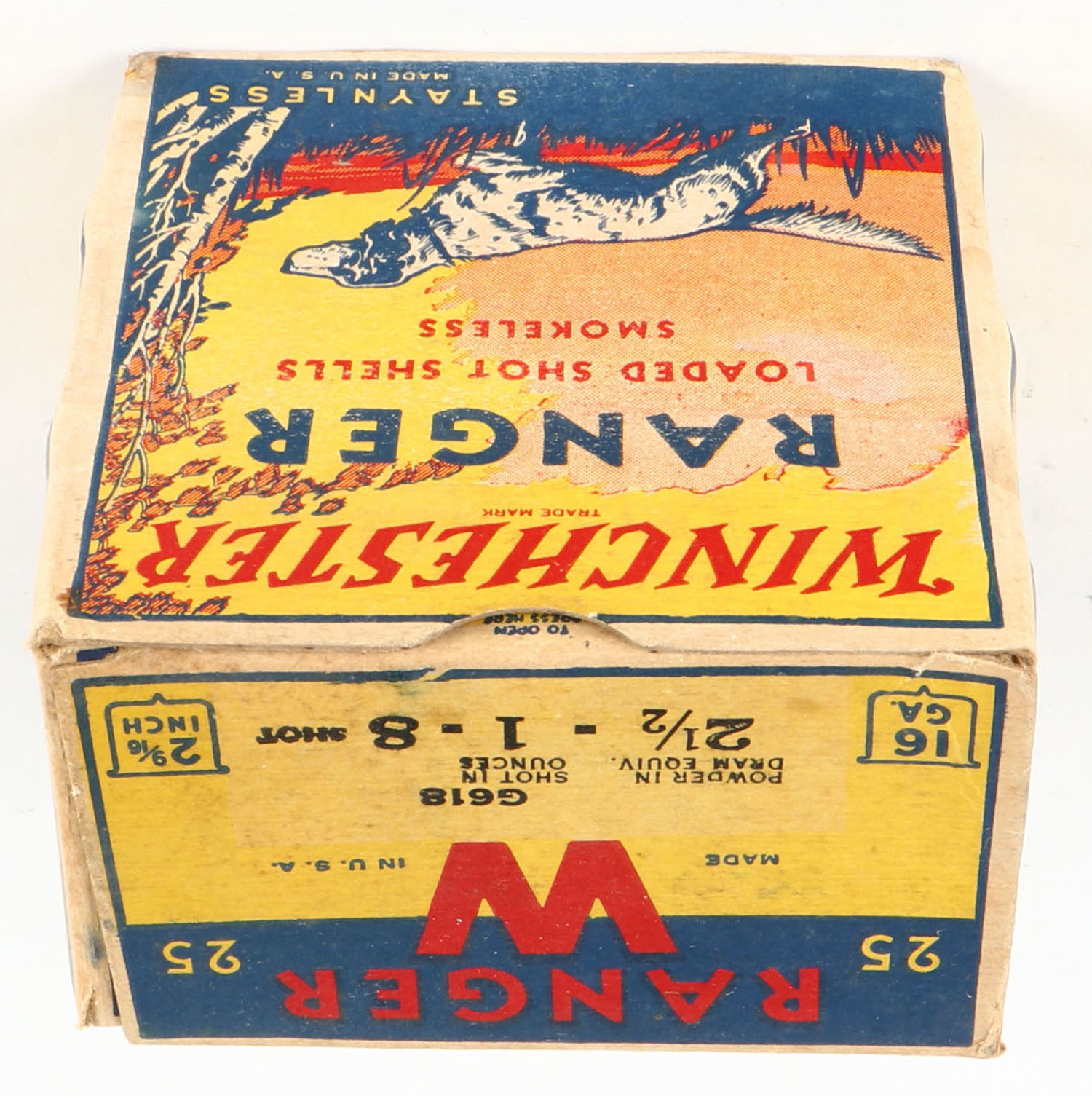 Winchester, Ranger, 16ga, 1pc., Full, shot size 8, multi-colored box, dog on point, 2 9/16'', box has a seam split with minor scuffing, paper shells are excellent. Grade: Excellent - Value: 40 to 100