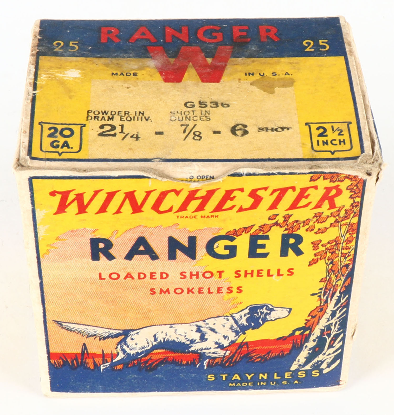 Winchester, Ranger, 20ga, 1pc., 2 1/2'', Empty, Shot Size 6, multi colored box with dog on point, box has light edge wear & light scuffing with great colors. Grade: Very Good ++ - Value: 20 to 80