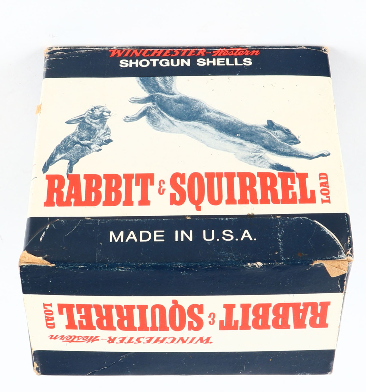 Winchester-Western, Rabbit & Squirrel, 12ga., shot size 6, red, blue, & white box, box is very solid, plastic shells are very good. Grade: Excellent + - Value: 10 to 30