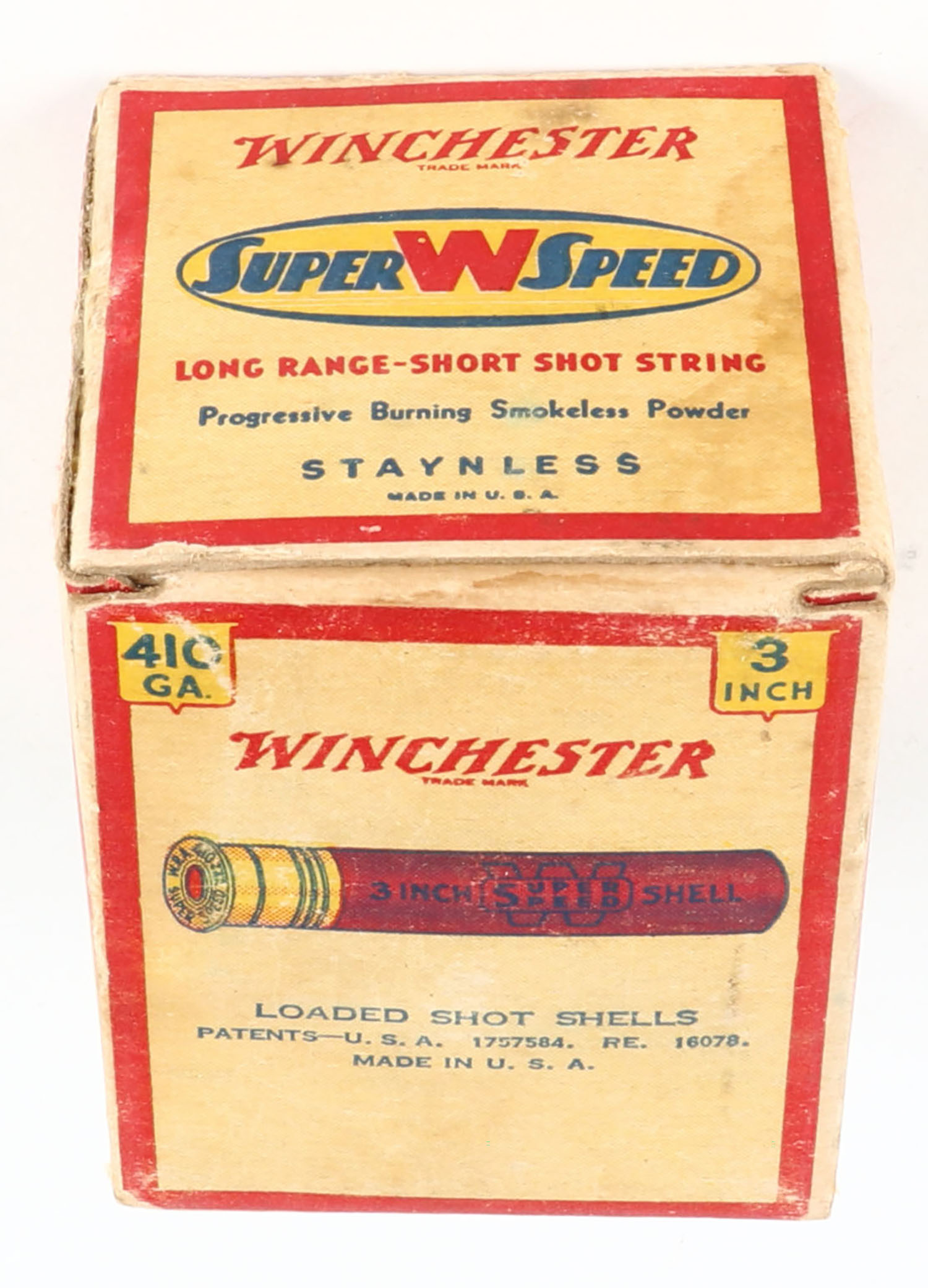 Winchester, Super W Speed, 410ga., Staynless, 3'', 1pc., Full, shot size 7 1/2, cream, red, blue and yellow box, box is very solid with great colors, has light age soiling, paper shells are very good. Grade: Very Good ++ - Value: 20 to 60