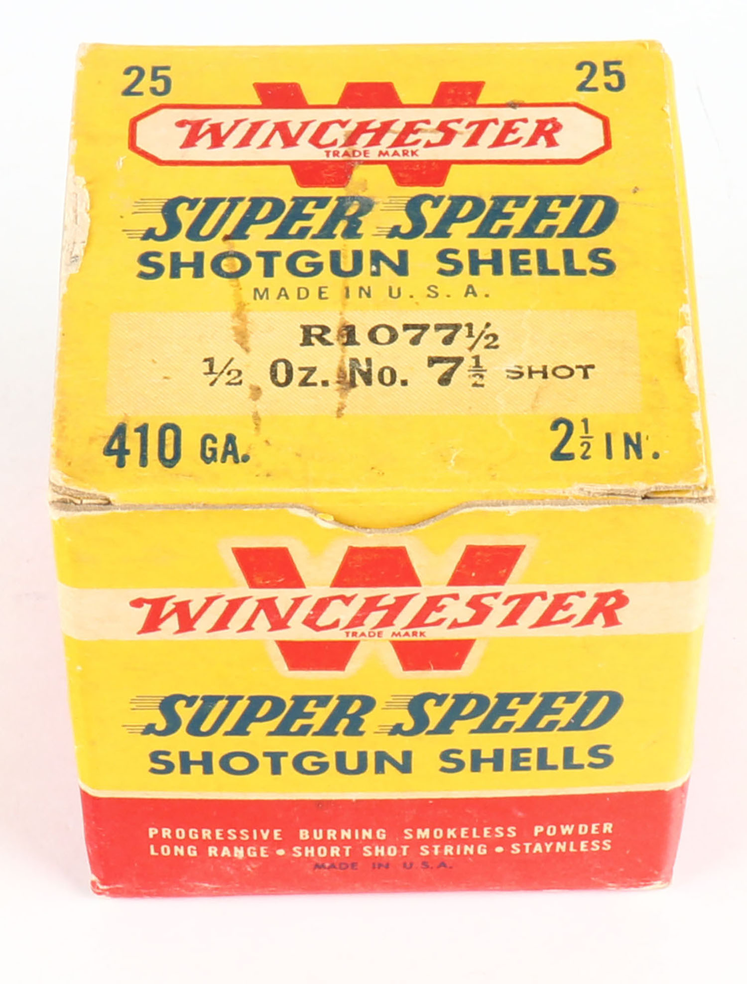 Winchester, Super Speed, 410ga., 2 1/2'', 1pc., Full, shot size 7 1/2, red, black and yellow box, box is very solid, paper shells are minty. Grade: Excellent + - Value: 10 to 40