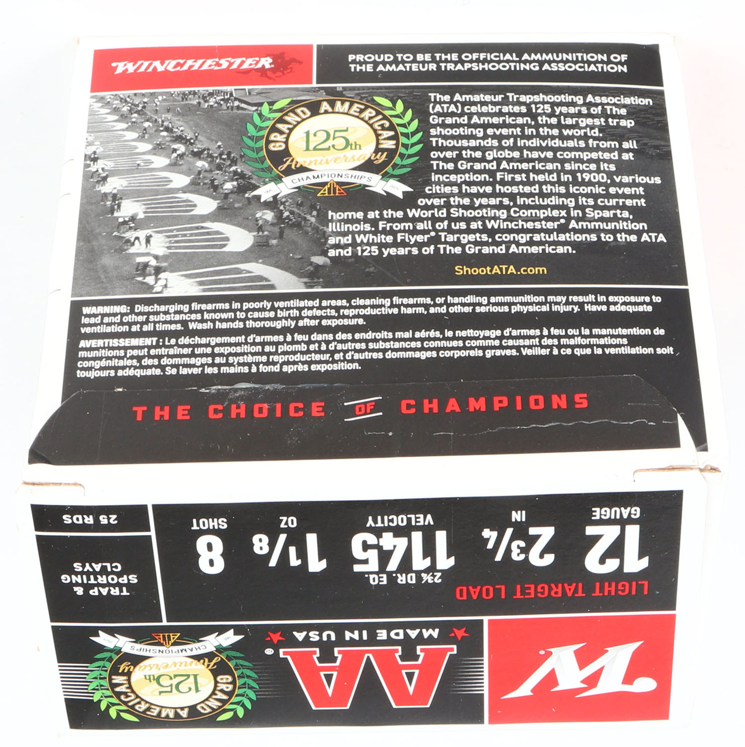 Winchester, Grand American 125th Anniversary, 12ga., 1pc., Full, shot size 8, box is very solid with excellent colors, plastic shells are excellent. Grade: MINT - Value: 20 to 80