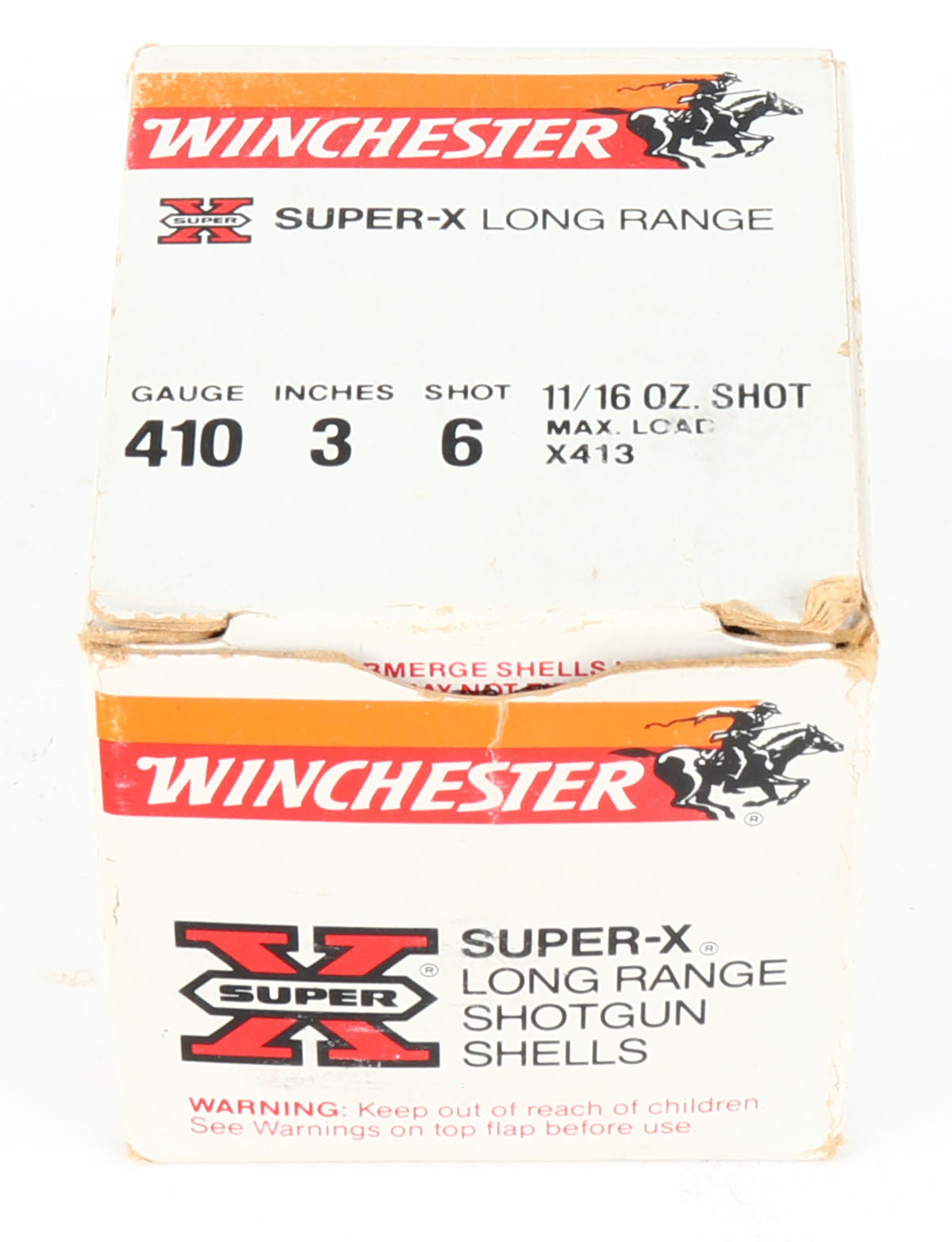 Winchester, Super X, 410ga., 1pc., Full, shot size 6, box has corner wear, plastic shells are very good. Grade: Very Good ++ - Value: 10 to 40