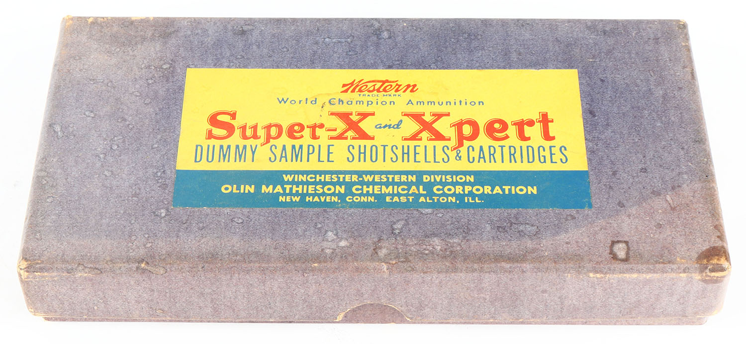Early Western Salesman Sample Mixed Ammo, 3 Window shells & 1 cut away shells, shells inside are very good, 5 rifle/pistol rounds 2 bullets one being fired while other is cut away top of box has yellow label with Super-X and Xpert, box has light age soiling WITH FANTASTIC BLUE TOP LID. Grade: Excellent - Value: 100 to 400