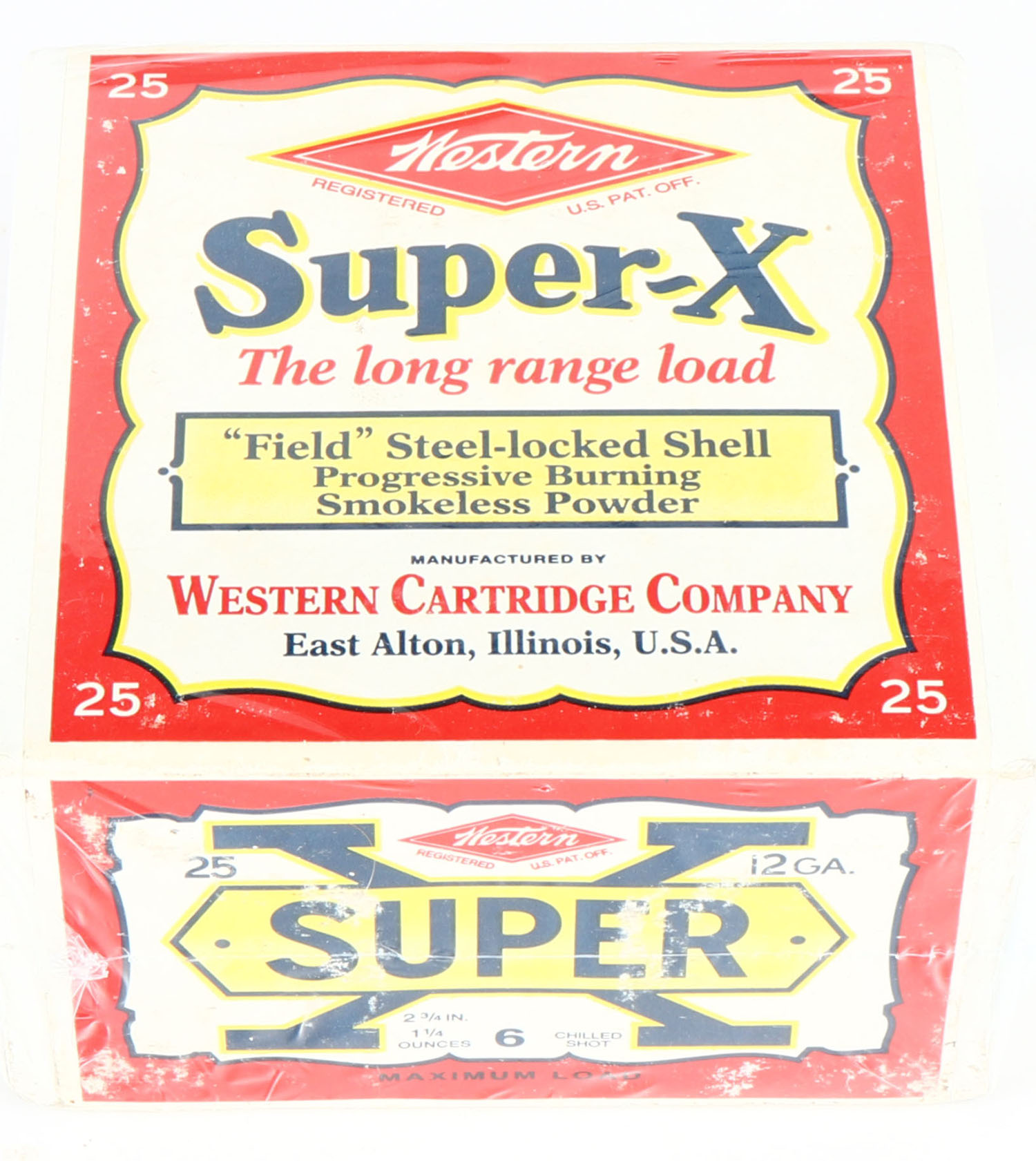 Western, Super-X, 12ga., 2pc., FULL & SEALED, shot size 6 Chilled Shot, 2 3/4'', white box with multi colored label, box & label are great, Circa 1990's. Grade: Excellent ++ - Value: 20 to 80