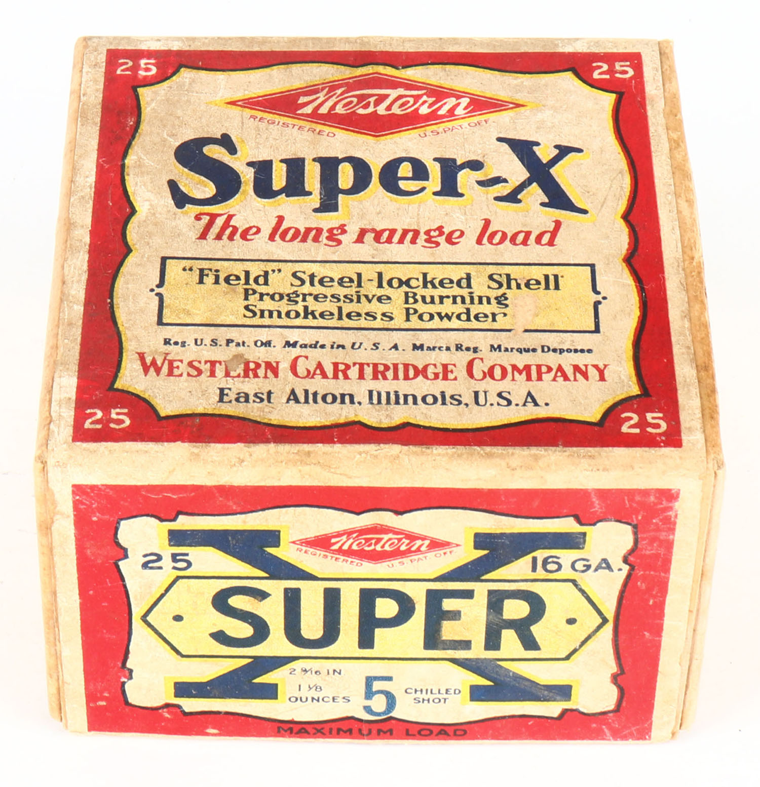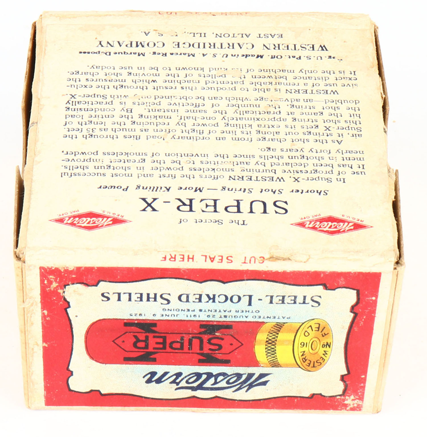 Western, Super X, 16ga., 2pc., FULL & HALF SEALED, shot size 5Ch., buff box with multi-colored label, box has scuffing with light age soiling. Grade: Very Good ++ - Value: 40 to 200