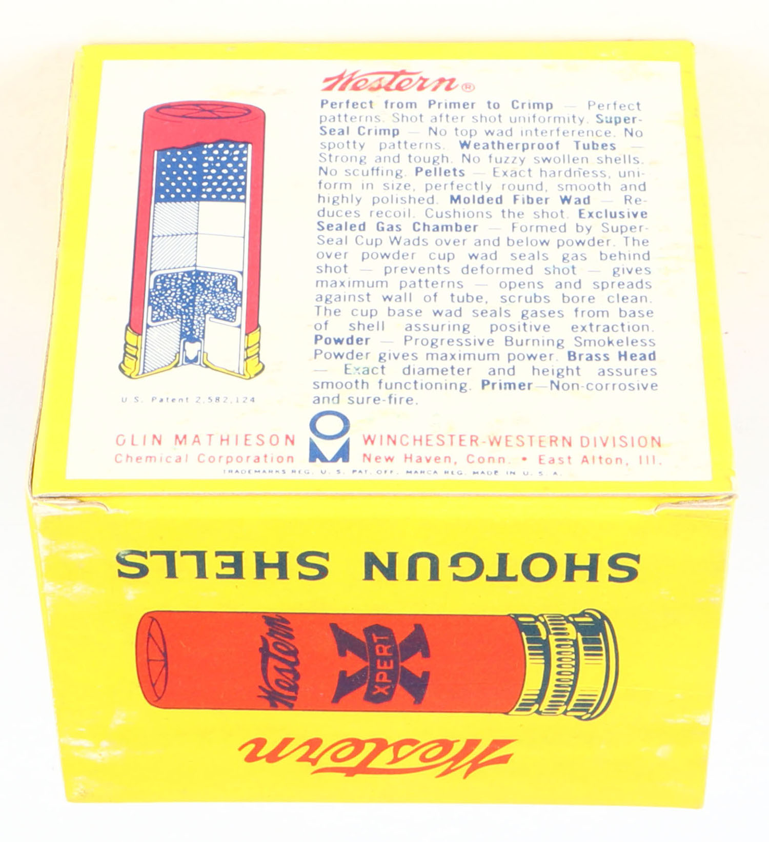 Western, Xpert, 20ga., 2 3/4'', 1pc., Full, shot size 8, multi-colored box, box is very solid with great colors, paper shells are minty. Grade: MINT - Value: 20 to 60