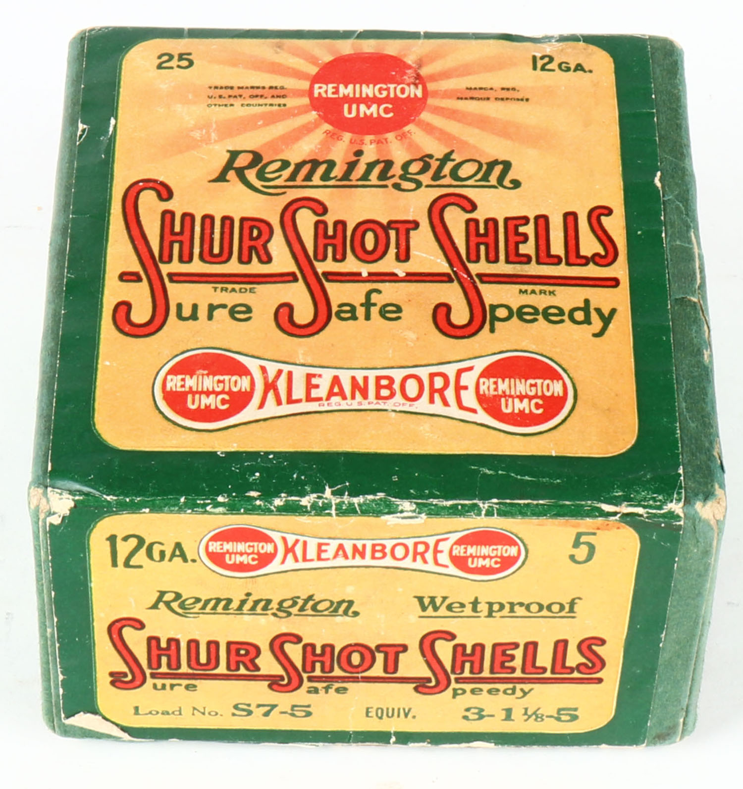Remington UMC, Shur Shot Shells, 12ga., 2pc., Partial 21rds of mixed shells, shot size 5, green box with green, yellow & red paper label, box has light age soiling with edge & corner wear, mixed shells are very good. Grade: Very Good + - Value: 20 to 140