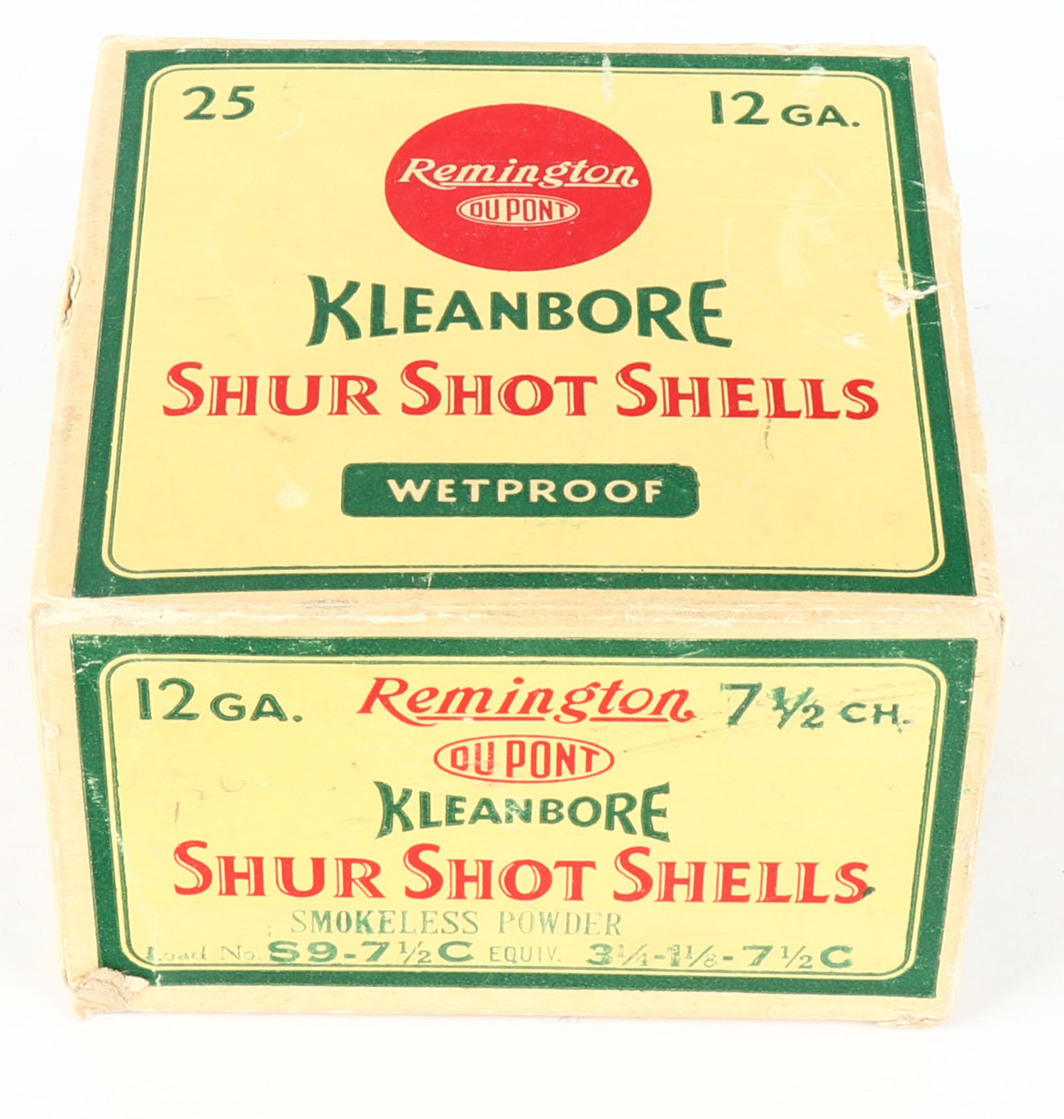 Remington Kleanbore, SHUR SHOT SHELLS, 12ga., 1pc., Full, shot size 7 1/2 Ch., box is yellow, red and green, box has light scuffing with great colors, paper shells are excellent. Grade: Excellent - Value: 10 to 50