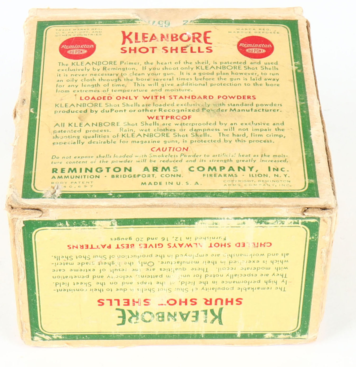 Remington Kleanbore, SHUR SHOT SHELLS, 16ga., 1pc., Full, shot size 6C, box is yellow, red and green, box has age soiling & edge wear, paper shells are very good. Grade: Very Good - Value: 20 to 60