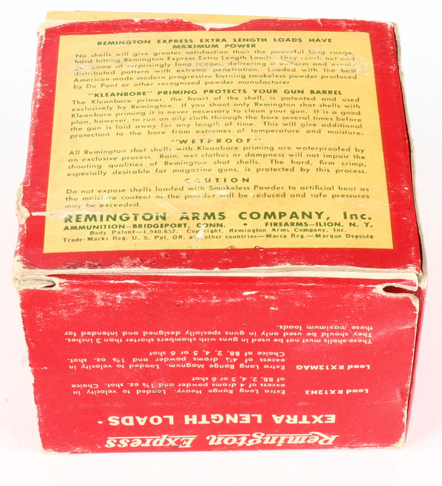 Remington Express, Extra Length, Magnum, 12ga., 1pc., Full, shot size 2, 3'', red, white and green box, box has scuffing with edge wear, paper shells are excellent. Grade: Very Good - Value: 10 to 40
