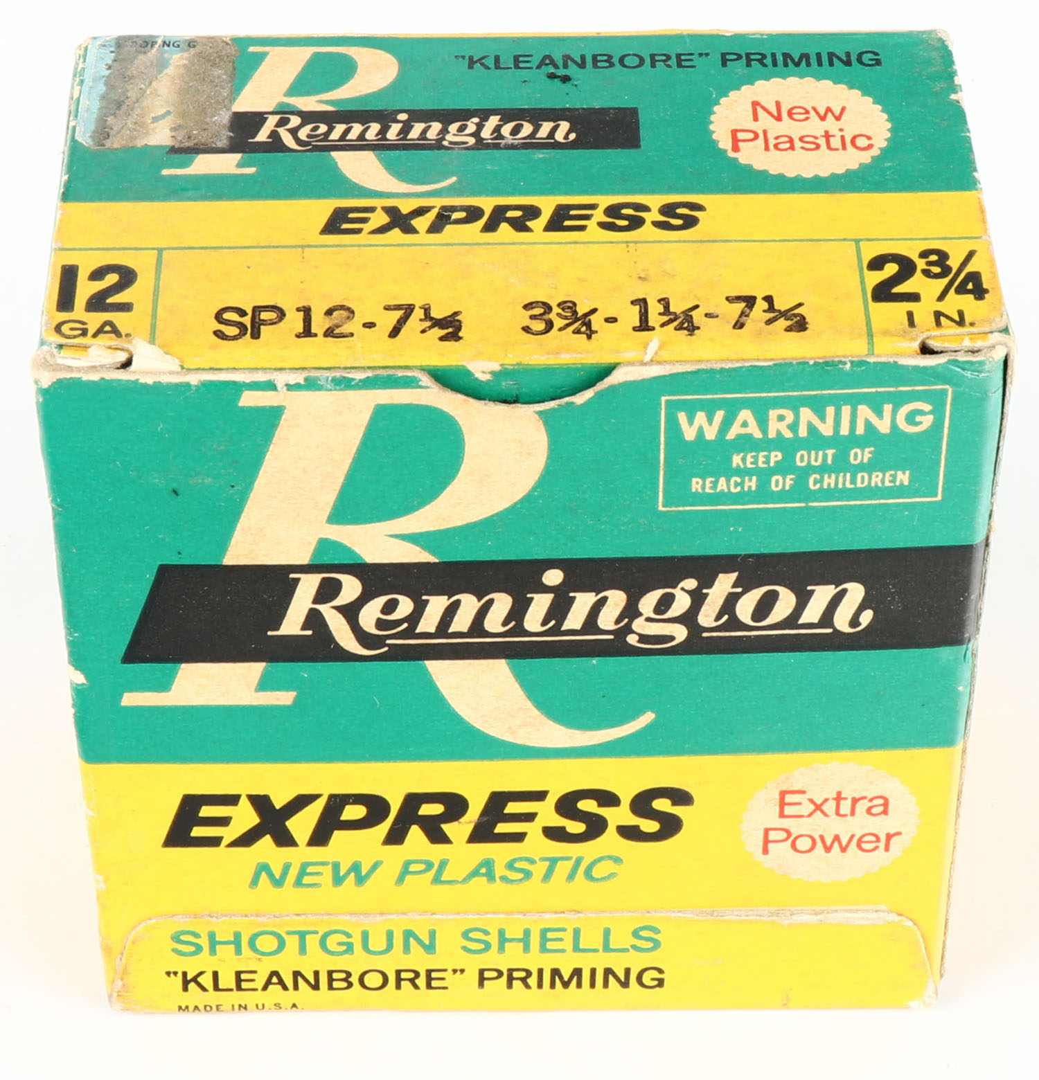 Remington, Express, 12ga., 1pc., Full, shot size 7 1/2, multi-colored box, box is solid with some scuffing, plastic shells are very good. Grade: Very Good + - Value: 10 to 40