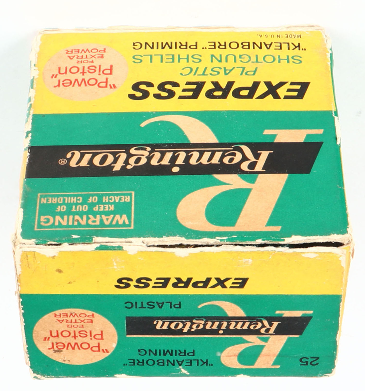 Remington, Express, 12ga., 1pc., Full, shot size 6, multi-colored box, box has a seam split with edge wear, plastic shells are very good. Grade: Good ++ - Value: 10 to 40
