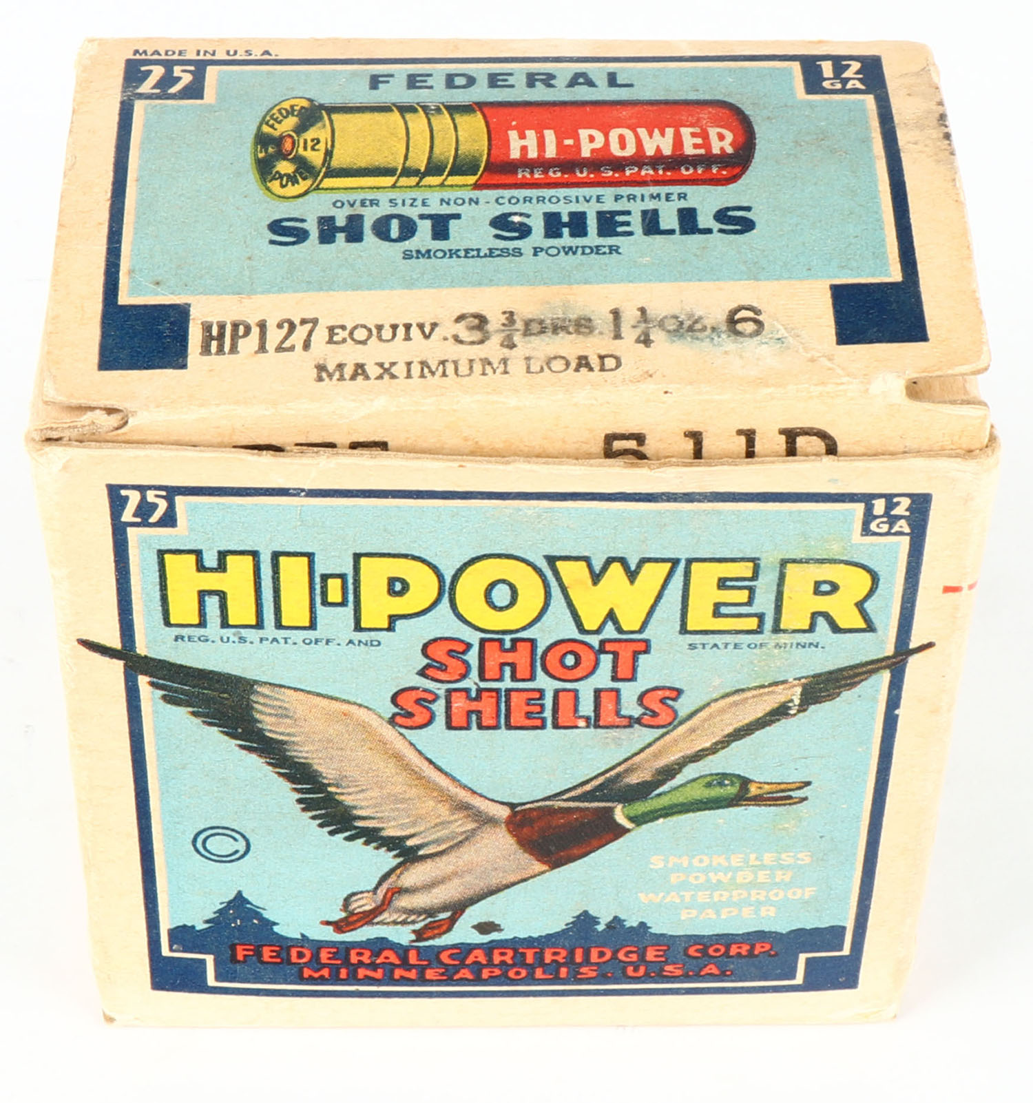 Federal Cart. Co., HI-POWER, 12ga., 1pc., Partial 20rds., shot size 6, Blue border, blue, yellow and red box with flying mallard, box has age soiling with great colors, paper shells excellent. Grade: Very Good - Value: 10 to 40