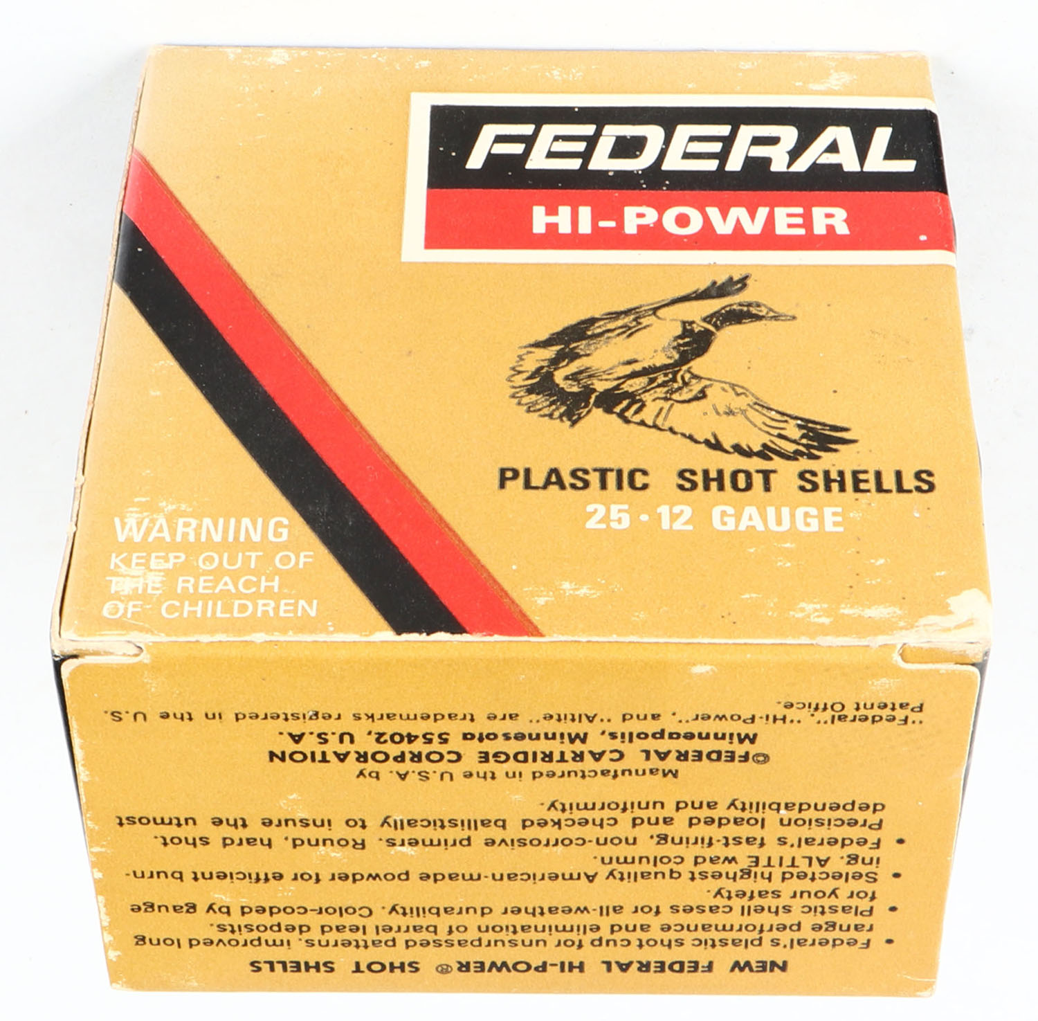 Federal, Hi-Power, 12ga., 2 3/4'', 1pc., Full, shot size 6 Maximum Load, multi-colored box, box is solid, plastic shells are excellent. Grade: Very Good ++ - Value: 10 to 30