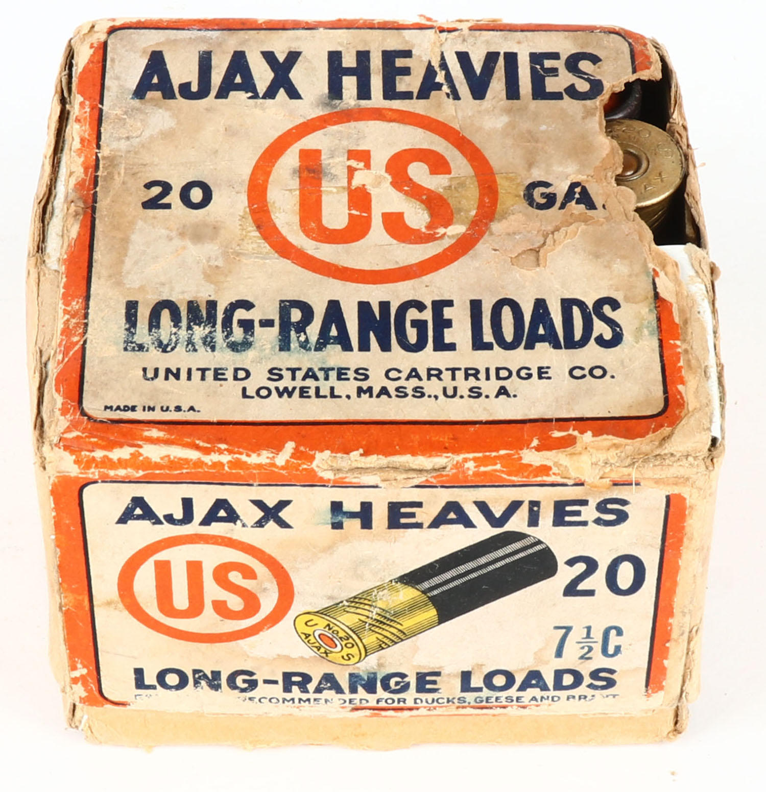 U.S. Cart. Co., Lowell, Mass., AJAX HEAVIES, 20ga., 2pc., Full, shot size 7 1/2C, RARE in 2 1/2'', buff box with white, orange & blue paper label, box has age soiling & scuffing, has a partial tear to front with a tape repair to inside, paper shells are excellent. Grade: Good ++ - Value: 20 to 100