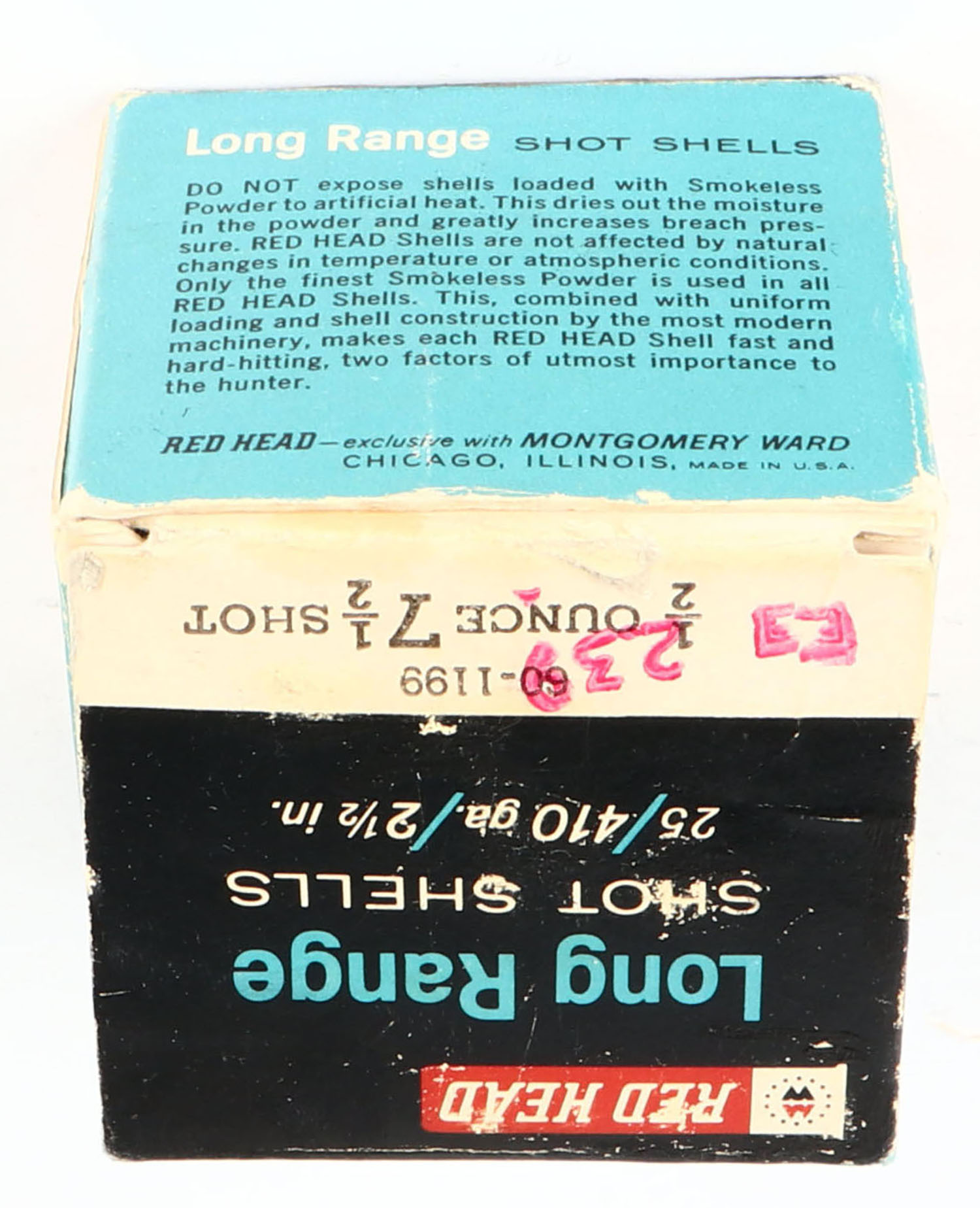 Wards Hawthorne, Long Range Shot Shells, 410ga., 2 1/2'', 1pc., Full, shot size 7 1/2, box has light scuffing with nice colors, paper shells are excellent. Grade: Excellent - Value: 10 to 30