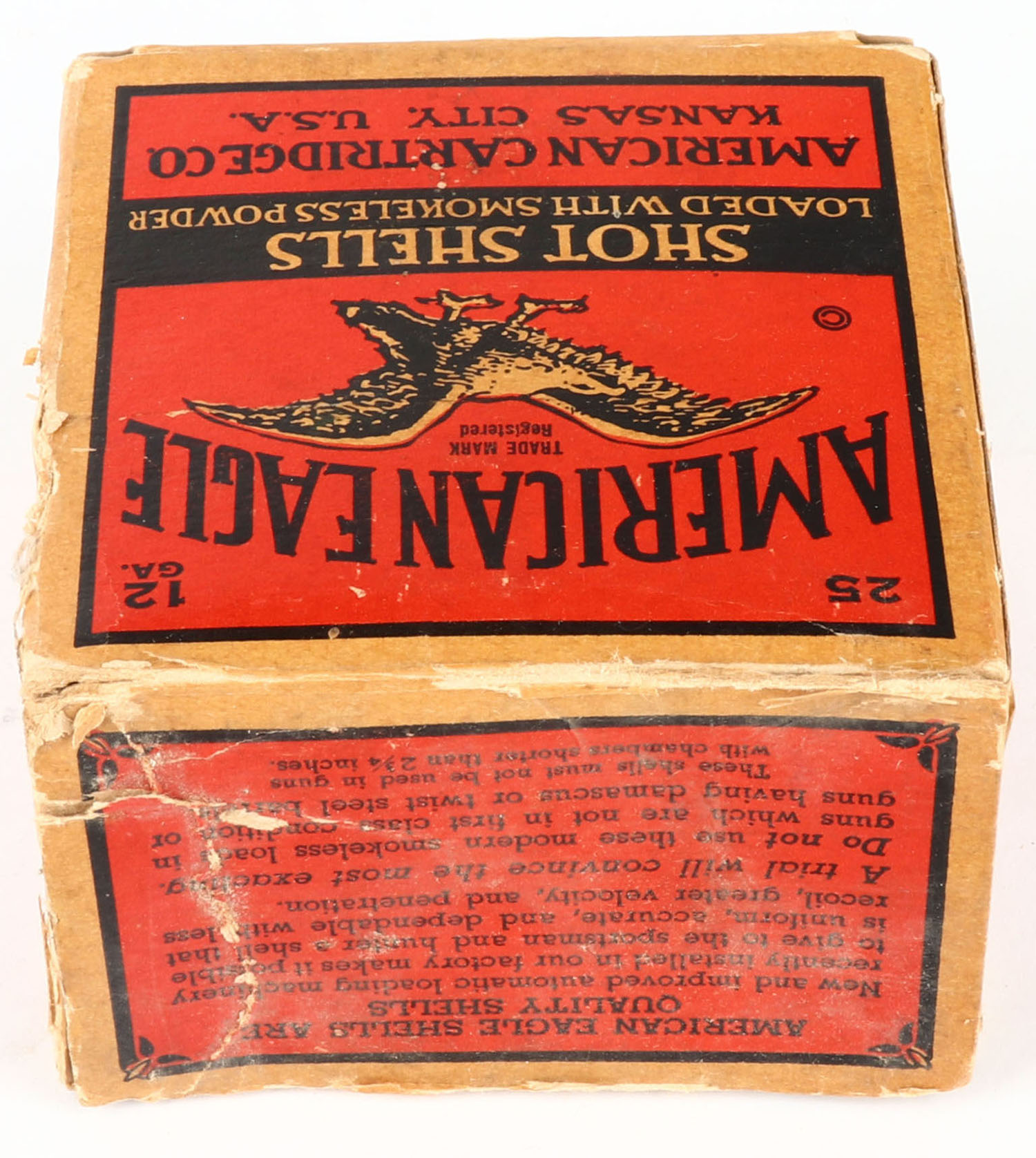 American Cart. Co., A-Grade, 12ga., 1pc., Partial 18rds., shot size 4Ch, buff, red & black box that pictures a flying eagle, box has some age soiling with edge wear, has a slight seam split, paper shells are very good. Grade: Good ++ - Value: 20 to 100