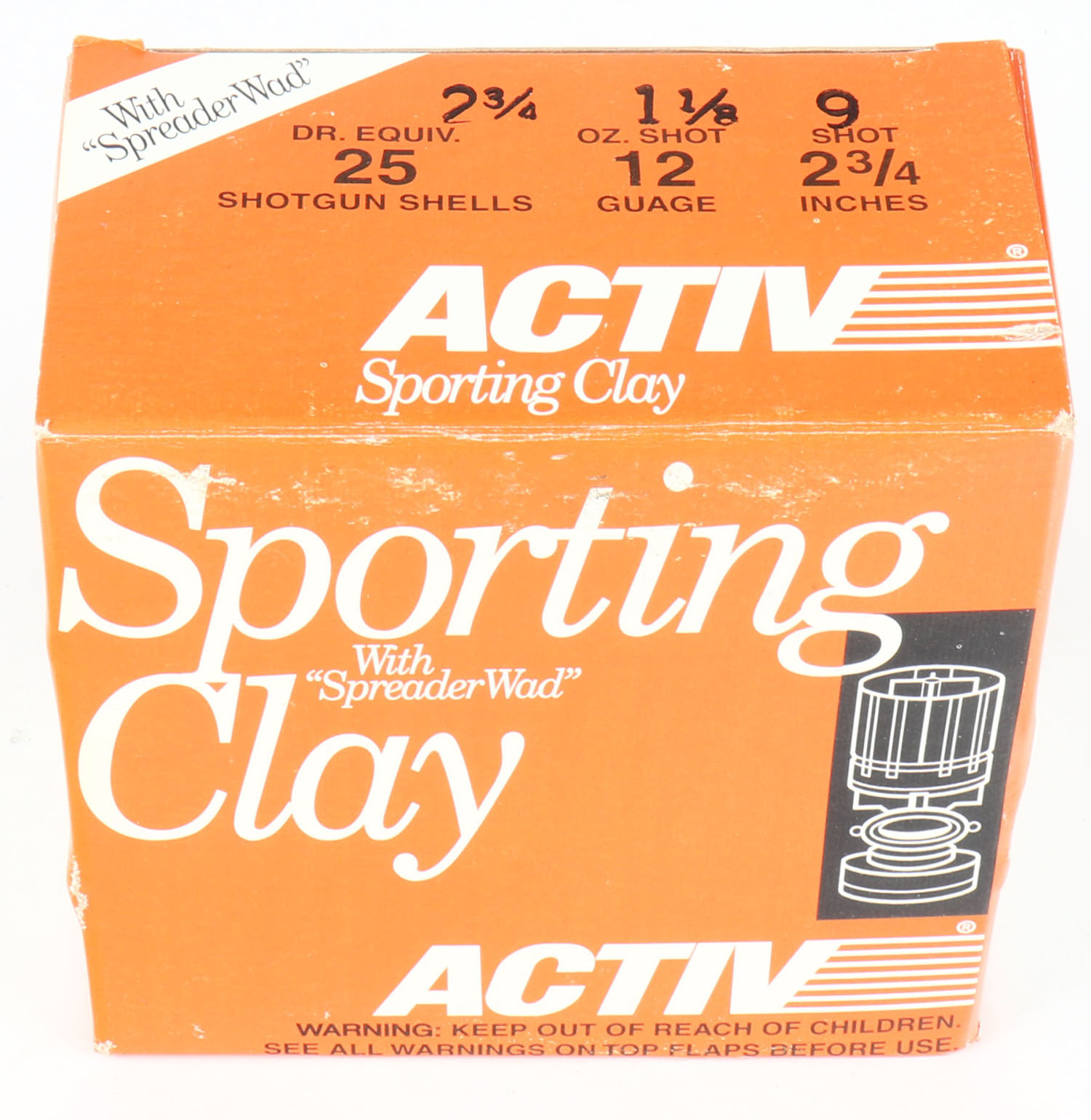 Activ, Sporting Clay, 12ga., Full, 1pc., shot size 9, multi-colored box, box is very solid, plastic shells are excellent. Grade: Excellent + - Value: 10 to 20
