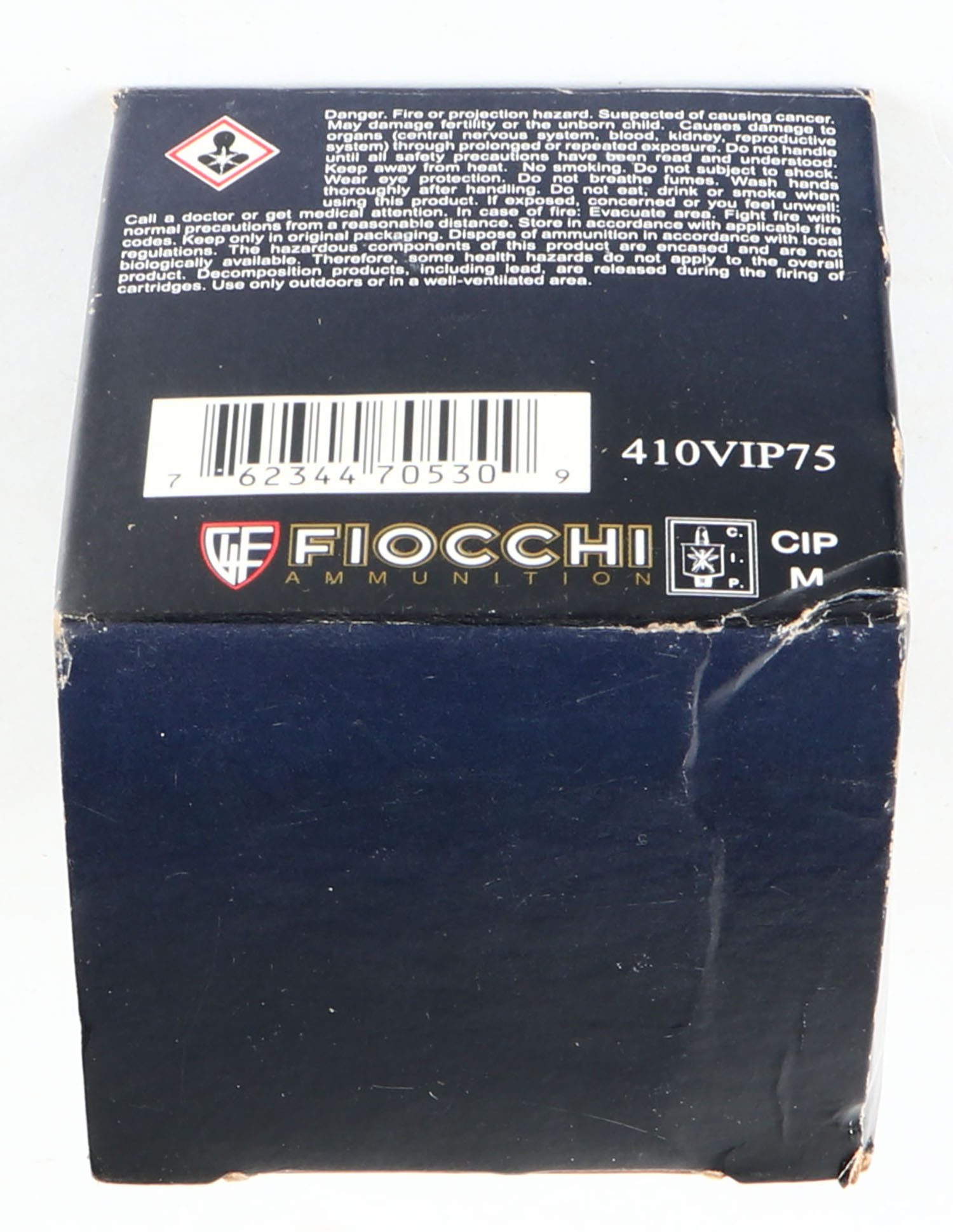 Fiocchi, Exacta Target Loads, 410ga., 1pc., Full, shot size 7 1/2, multi-colored box, box has some edge wear, plastic shells are excellent. Grade: Very Good + - Value: 10 to 30
