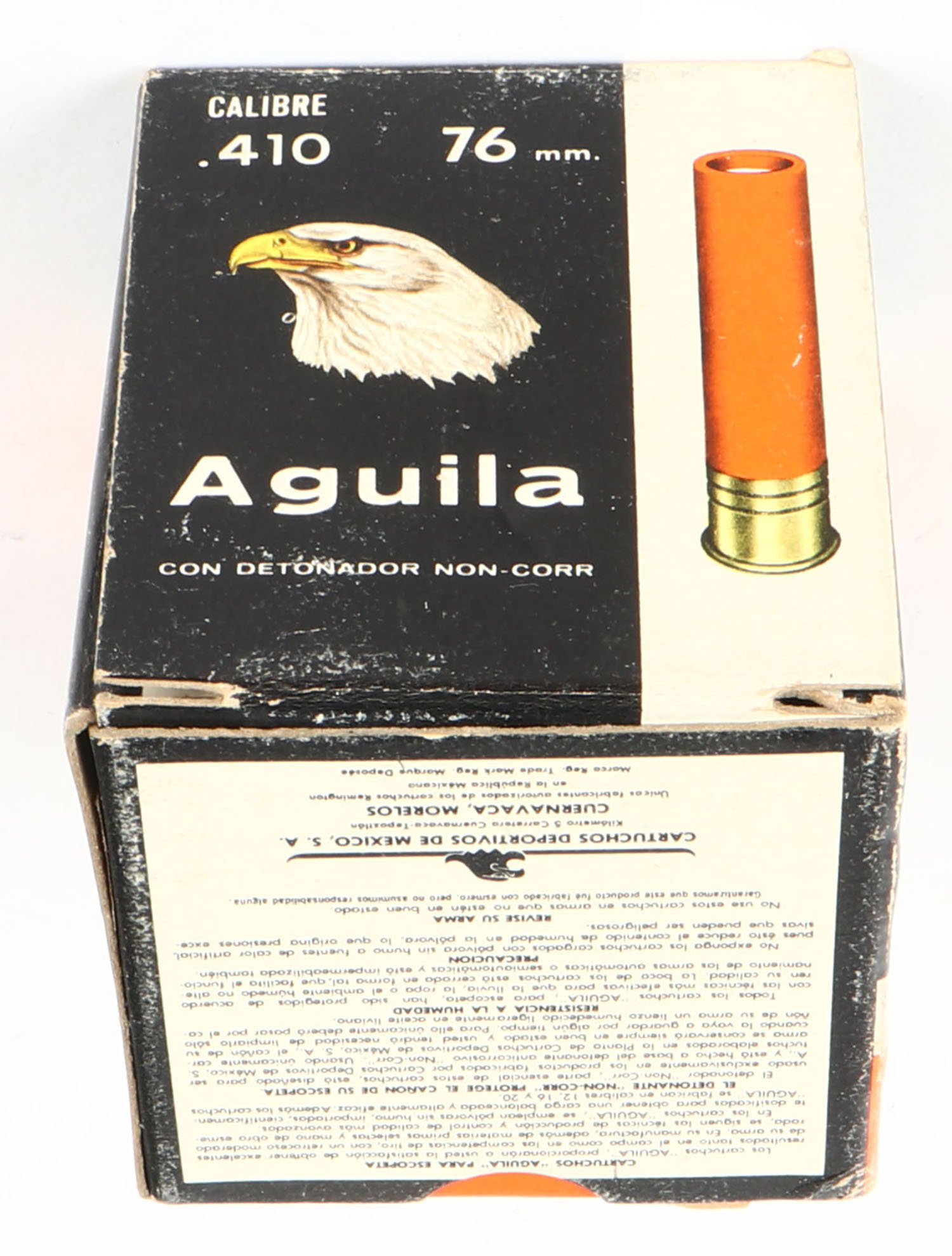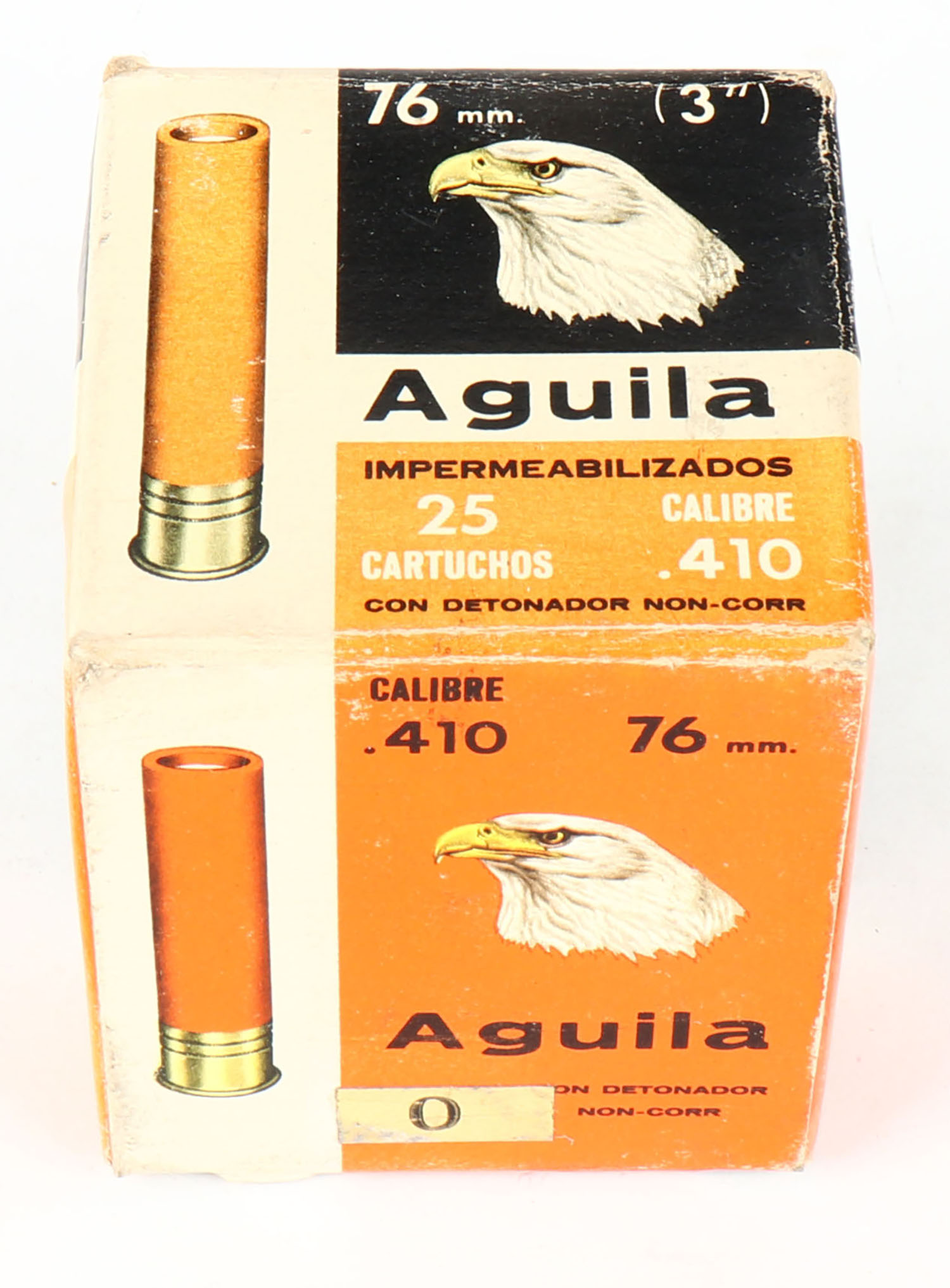 Aguila, 410ga., 3'', 1pc., Full, Rare in shot size 0, box is orange, black, and white, box has some scuffing & edge wear, paper shells are excellent. Grade: Very Good + - Value: 20 to 60