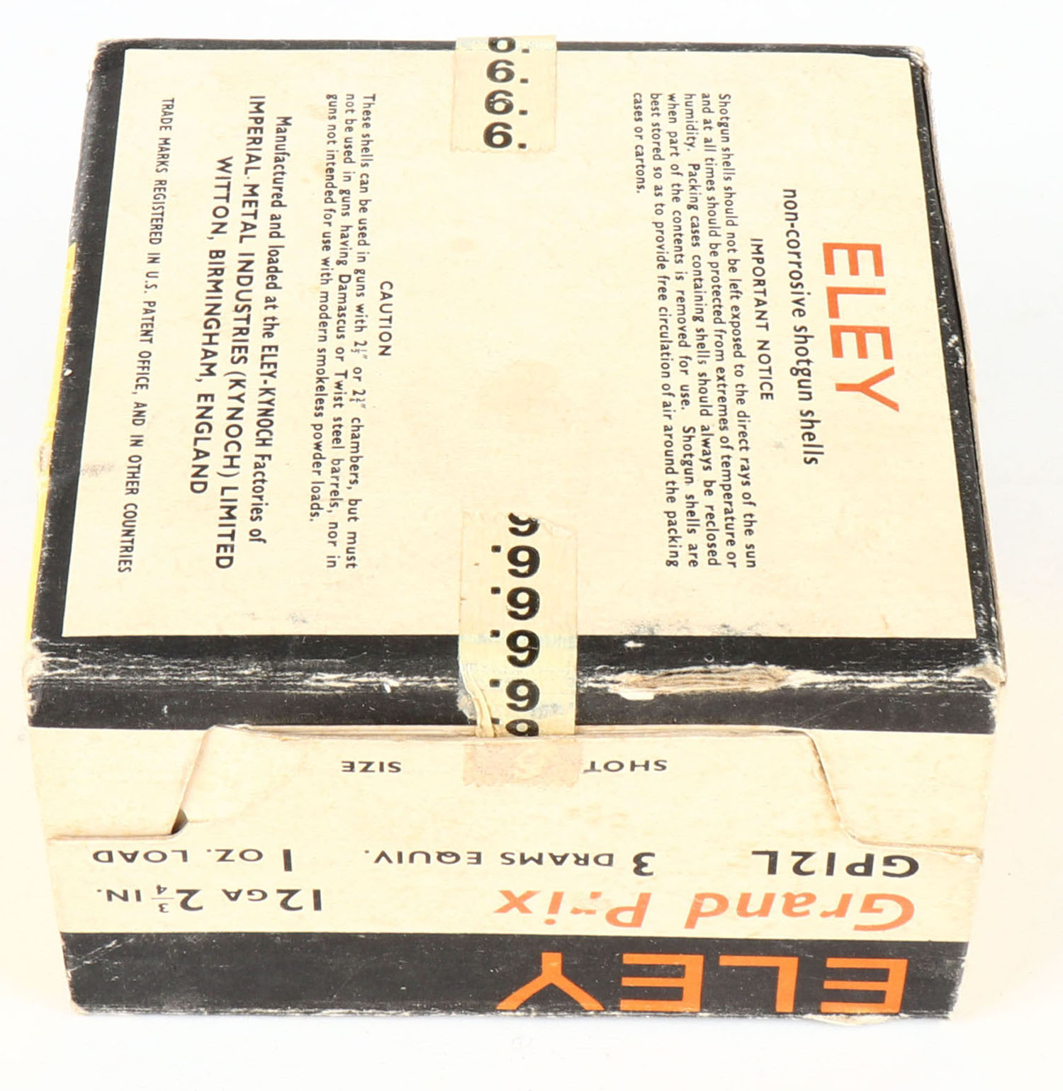 Eley, Grand Prix, 12ga., 1pc., Full, shot size 6, multi-color box, box is solid with scuffing, paper shells are excellent. Grade: Very Good ++ - Value: 10 to 40