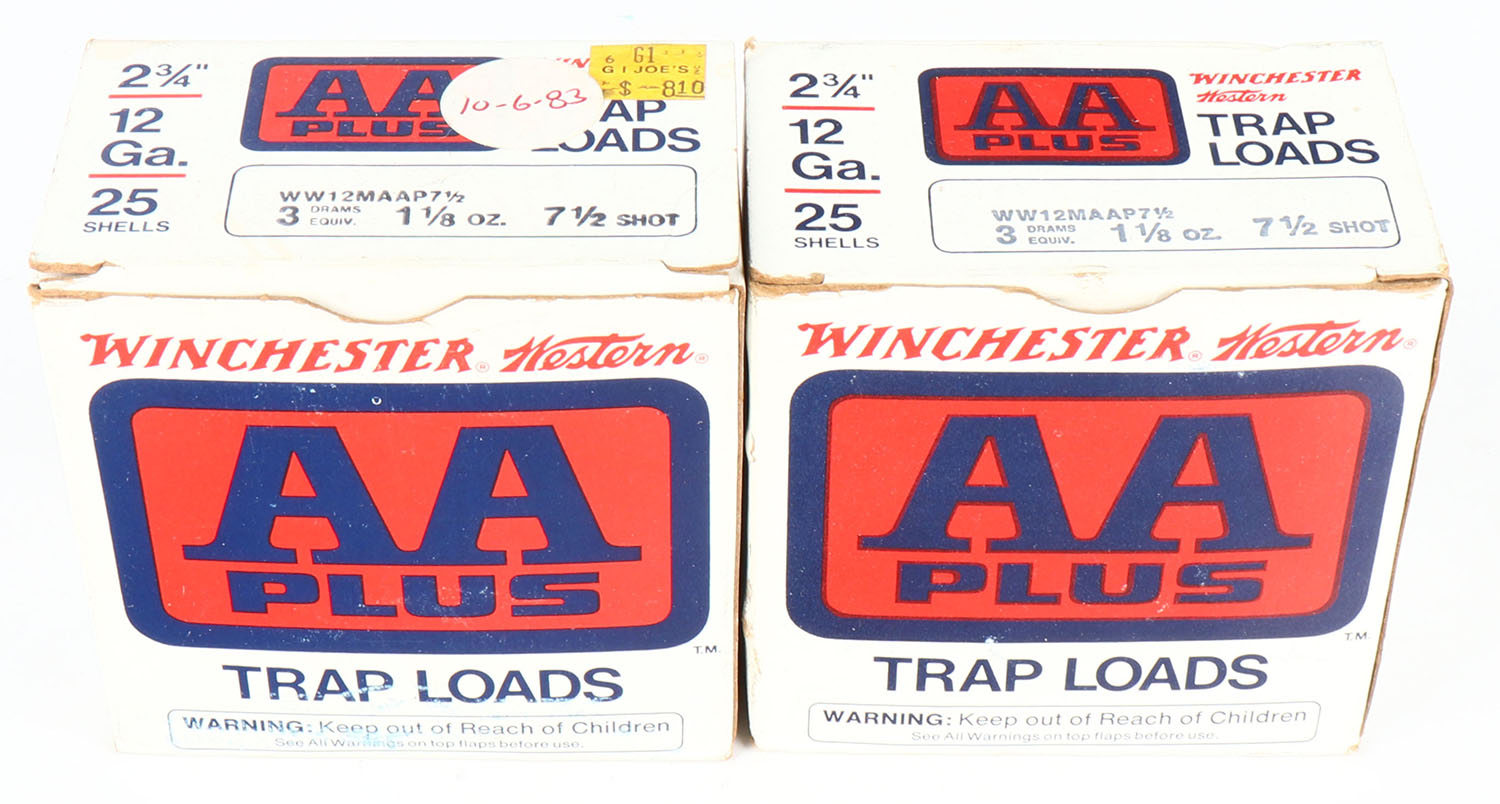 Lot of 2 Winchester Double AA Plus, 12ga., 1pc., 2 3/4'', Appears Full, shot size 7 1/2, boxes are solid,. Grade: Excellent - Value: 10 to 40