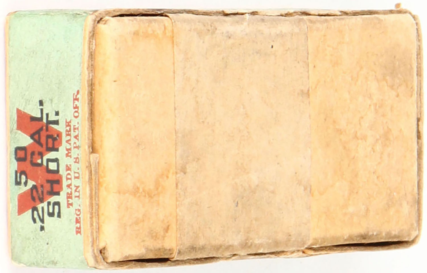 Winchester, Rifle Cartridges, .22 Short, RR: WRA-41 S-18b, Partial 49rds., 2pc. Buff box with green top & side sealing labels, box is solid with very good color, some age soiling, minor corner wear, very minor edge wear, labels are intact, ammo is very good. Grade: Very Good ++ - Value: 40 to 80