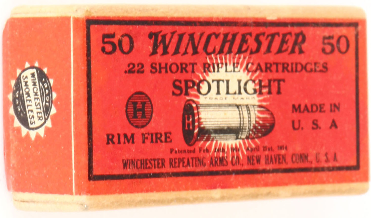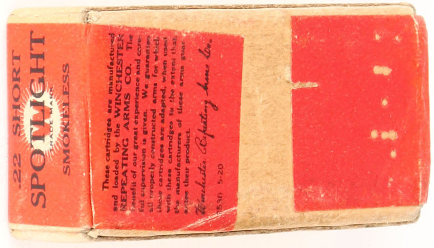Winchester, Spotlight, .22 Short, RR: WRA-81 SS-8a, FULL & SEALED, 2pc. Buff box with red wraparound label, box is solid with excellent color, very minor corner wear, edges are crisp, label is intact. Grade: Excellent ++ - Value: 150 to 300