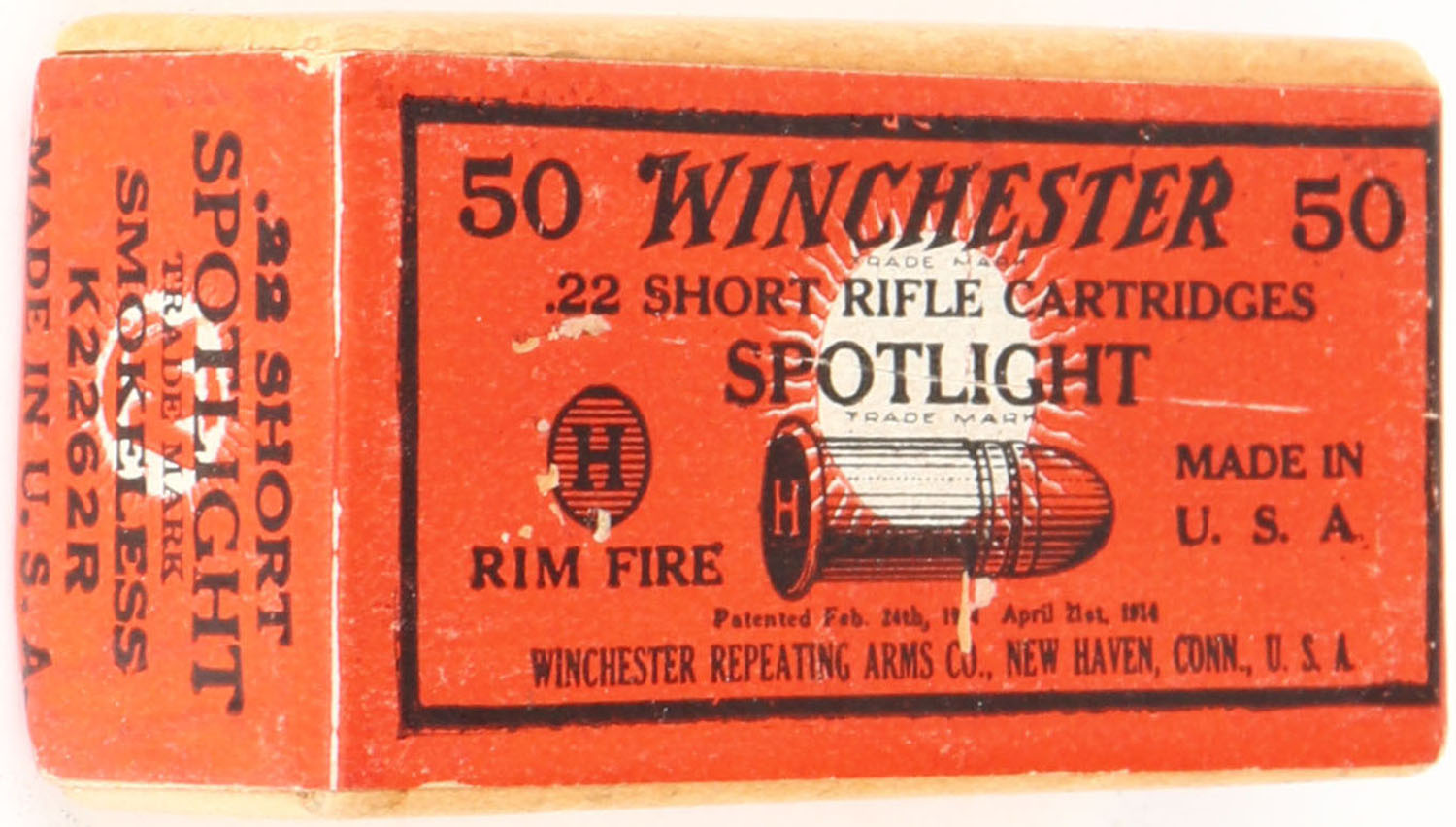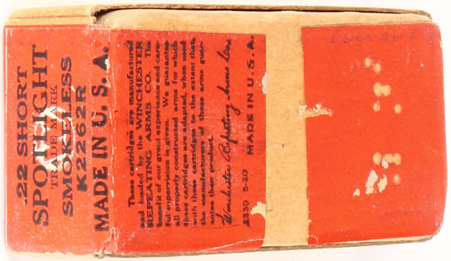 Winchester, Spotlight, .22 Short, RR: WRA-81 SS-8c, FUL & SEALED, 2pc. Buff box with red wraparound label, box is solid with excellent color, very minor shelf & corner wear, edges are crisp, label is intact. Grade: Excellent + - Value: 150 to 300