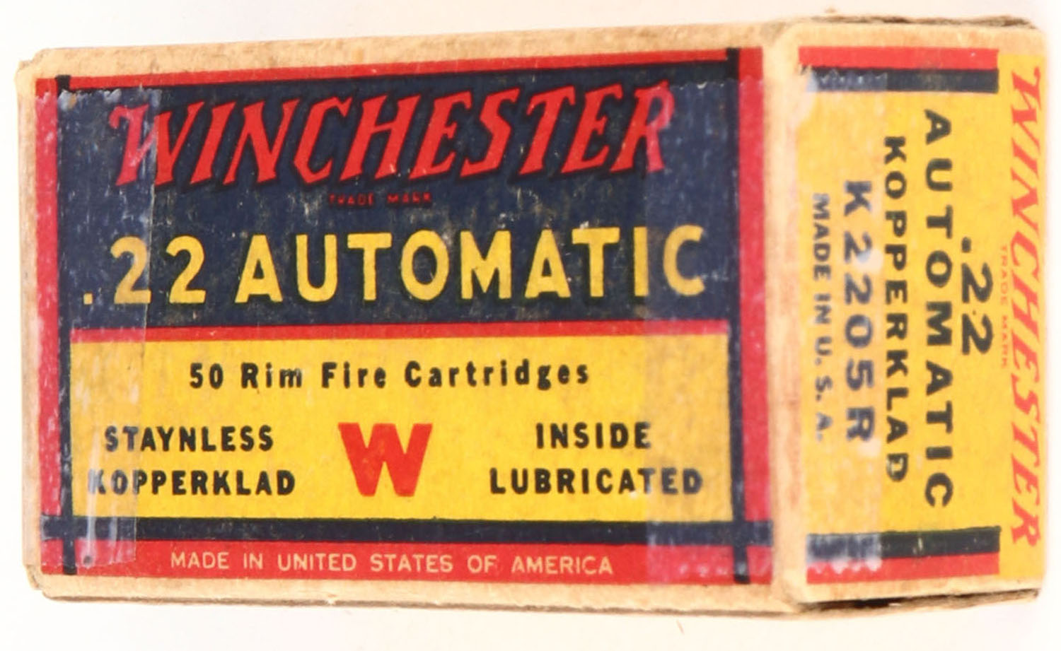 Winchester, Staynless Kopperklad, .22 Automatic, Inside Lubricated, RHWeb: WRA-15 WA-1b, Full, 1pc. Yellow blue & red box, both end flaps are torn & taped, excellent color, minor age soiling, minor edge & corner wear, end flaps are solid, ammo is excellent. Grade: Good ++ - Value: 40 to 60