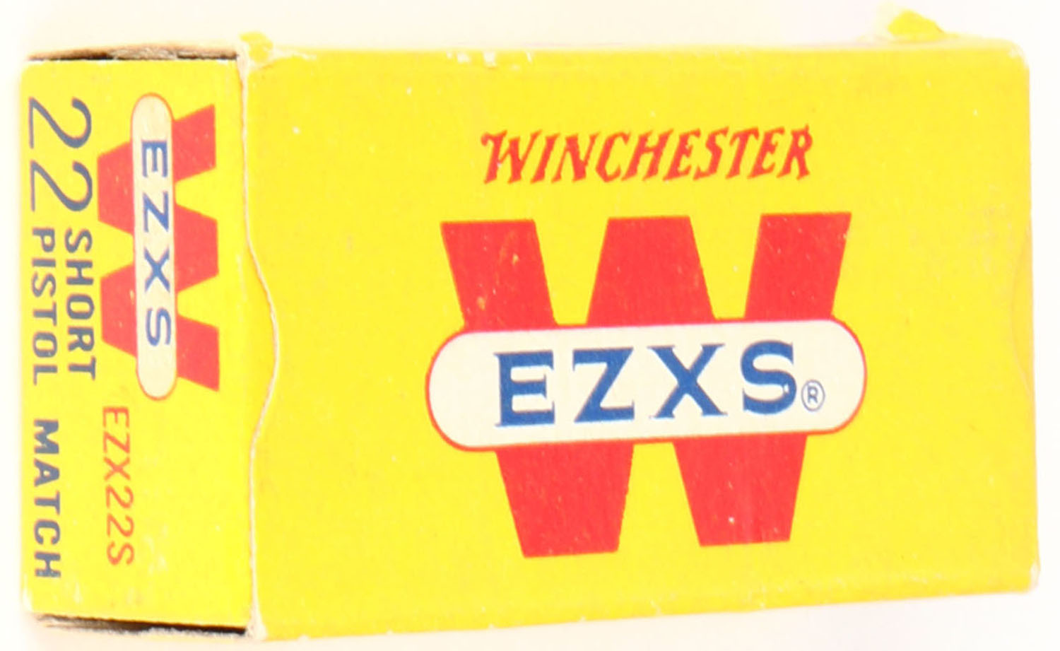 Winchester, EZXS, .22 Short, Pistol Match, RHWeb: WRA-54 S-1, Full, 1pc. Yellow red & white box, box is solid with excellent color, very minor shelf & corner wear, edges are mostly crisp, end flaps are solid, ammo is minty. Grade: Excellent + - Value: 70 to 120