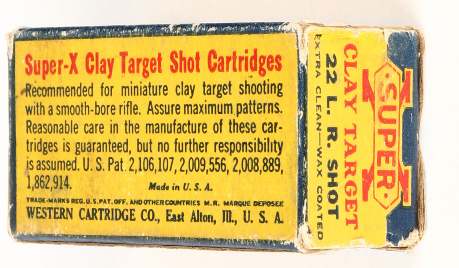 Western, Super-X, .22 Long Rifle Shot, Extra Clean Wax Coated, RHWeb: WCC-Super-X-Long Rifle-49 LRS-10, Full, 1pc. Yellow blue & red box, box is solid with excellent color, minor age soiling, corner wear, tear on top, some edge wear, end flaps are solid, ammo is excellent. Grade: Very Good + - Value: 14 to 30