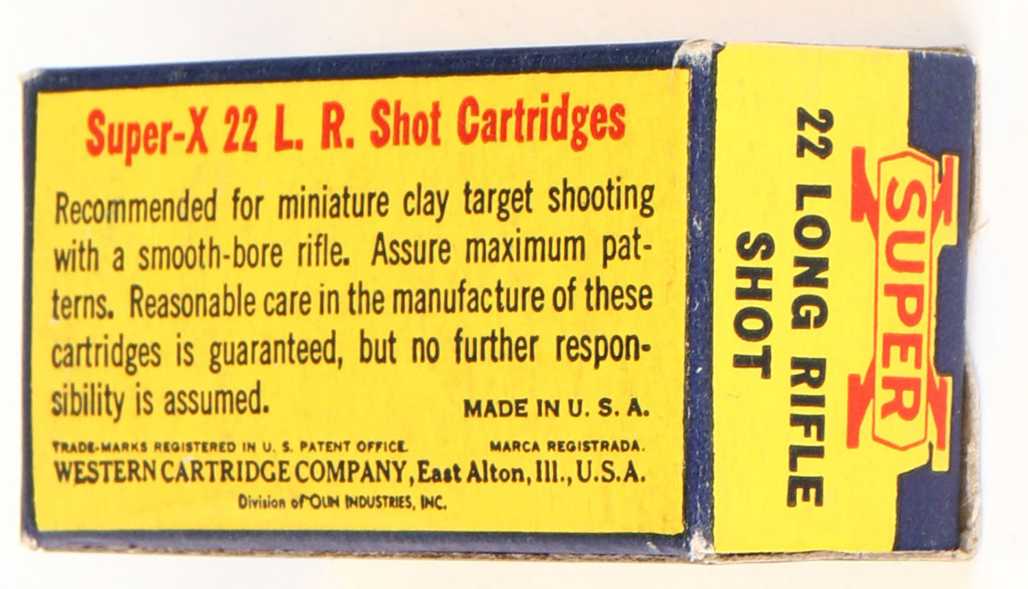 Western, Super-X, .22 Long Rifle Shot, Extra Clean Wax Coated, RHWeb: WCC-Super-X-Long Rifle-49 LRS-10, Full, 1pc. Yellow blue & red box, box is solid with excellent color, very minor corner wear, edges are crisp, end flaps are solid, ammo is excellent. Grade: Excellent ++ - Value: 24 to 36