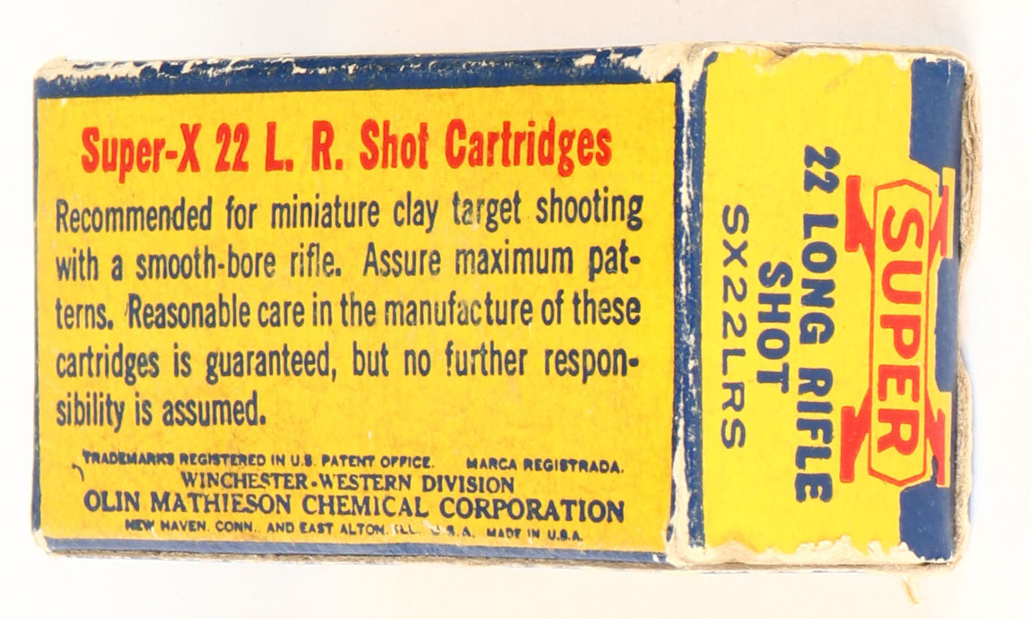 Western, Super-X, .22 Long Rifle Shot, Extra Clean Wax Coated, RHWeb: Super-X Long Rifle WCC-49 LRS-21, Full, 1pc. Yellow blue & red box, box is solid with excellent color, very minor edge & corner wear, end flaps are solid, ammo is excellent. Grade: Excellent - Value: 12 to 20