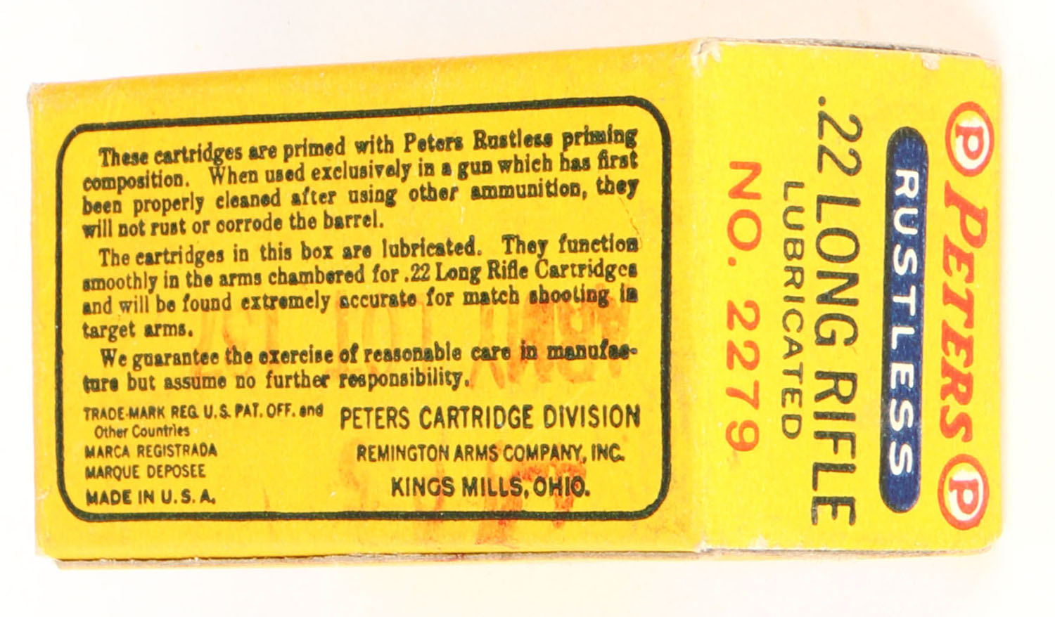 Peters, Rustless, .22 Long Rifle, Lubricated Bullet, Smokeless Powder, Army Lot 137, RHWeb: PCC-8C LR-2b, Full, 1pc. Blue yellow & red box, box is solid with excellent color, some shelf wear on top, corners are mostly sharp, edges are crisp, end flaps are solid, ammo is very good. Grade: Very Good ++ - Value: 20 to 30