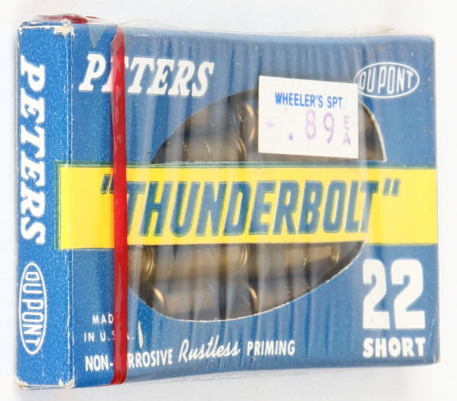 Peters, ''Thunderbolt'', .22 Short, RHWeb: PCC-17 S-5, Full, 1pc. Blue yellow & white flat pack, pack is solid with minty color, corners are sharp, edges are crisp, ammo appears very good, cellophane wrap is 95% intact. Grade: Excellent + - Value: 50 to 75