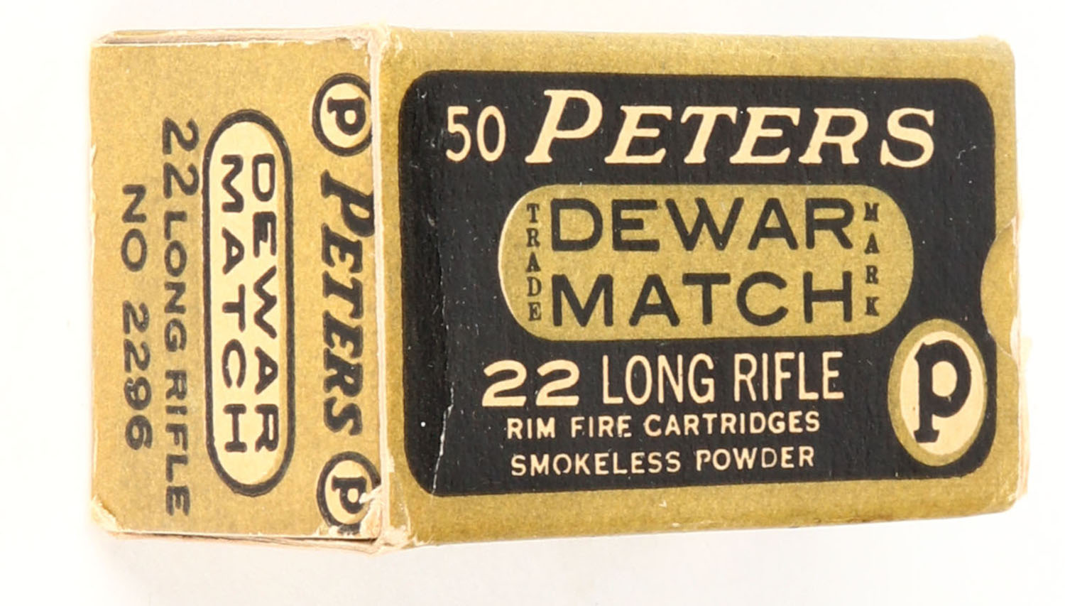 Peters, Dewar Match, .22 Long Rifle, RHWeb: PCC-53B LR-2c, Full, 1pc. Black & gold box, box is solid with excellent color, some corner wear, edges are mostly crisp, end flaps are solid, ammo is minty. Grade: Excellent - Value: 28 to 40